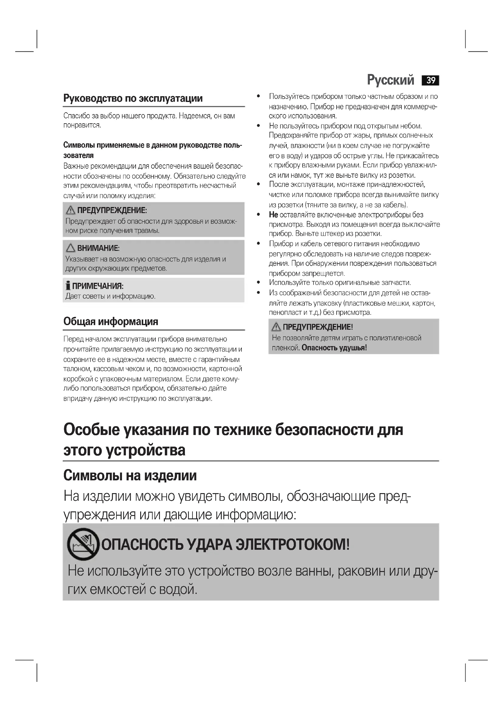 Руководство по эксплуатации Спасибозавыборнашегопродукта.Надеемся,онвампонравится.Символы применяемые в данном руководстве поль-зователяВажные рекомендации для обеспечения вашей безопас-ностиобозначеныпоособенному.Обязательноследуйтеэтим рекомендациям, чтобы преотвратить несчастный случай или поломку изделия: ПРЕДУПРЕЖДЕНИЕ: Предупреждает об опасности для здоровья и возмож-ном риске получения травмы. ВНИМАНИЕ: Указывает на возможную опасность для изделия и других окружающих предметов. ПРИМЕЧАНИЯ: Дает советы и информацию. Общая информация Перед началом эксплуатации прибора внимательно прочитайте прилагаемую инструкцию по эксплуатации и сохраните ее в надежном месте, вместе с гарантийным талоном, кассовым чеком и, по возможности, картонной коробкой с упаковочным материалом. Если даете кому-либо попользоваться прибором, обязательно дайте впридачу данную инструкцию по эксплуатации.• Пользуйтесьприборомтолькочастнымобразомипоназначению. Прибор не предназначен для коммерче-ского использования. • Непользуйтесьприборомподоткрытымнебом.Предохраняйте прибор от жары, прямых солнечных лучей, влажности (ни в коем случае не погружайте еговводу)иударовобострыеуглы.Неприкасайтеськ прибору влажными руками. Если прибор увлажнил-ся или намок, тут же выньте вилку из розетки.• Послеэксплуатации,монтажепринадлежностей,чистке или поломке прибора всегда вынимайте вилку из розетки (тяните за вилку, а не за кабель).• Не оставляйте включенные электроприборы без присмотра. Выходя из помещения всегда выключайте прибор. Выньте штекер из розетки.• Приборикабельсетевогопитаниянеобходиморегулярно обследовать на наличие следов повреж-дения. При обнаружении повреждения пользоваться прибором запрещяется.• Используйтетолькооригинальныезапчасти.• Изсоображенийбезопасностидлядетейнеостав-ляйте лежать упаковку (пластиковые мешки, картон, пенопласт и т.д.) без присмотра. ПРЕДУПРЕЖДЕНИЕ! Непозволяйтедетямигратьсполиэтиленовойпленкой. Опасность удушья! Особые указания по технике безопасности для этого устройства Символы на изделии Наизделииможноувидетьсимволы,обозначающиепред- упреждения или дающие информацию: ОПАСНОСТЬ УДАРА ЭЛЕКТРОТОКОМ! Неиспользуйтеэтоустройствовозлеванны,раковинилидру- гих емкостей с водой.Русский