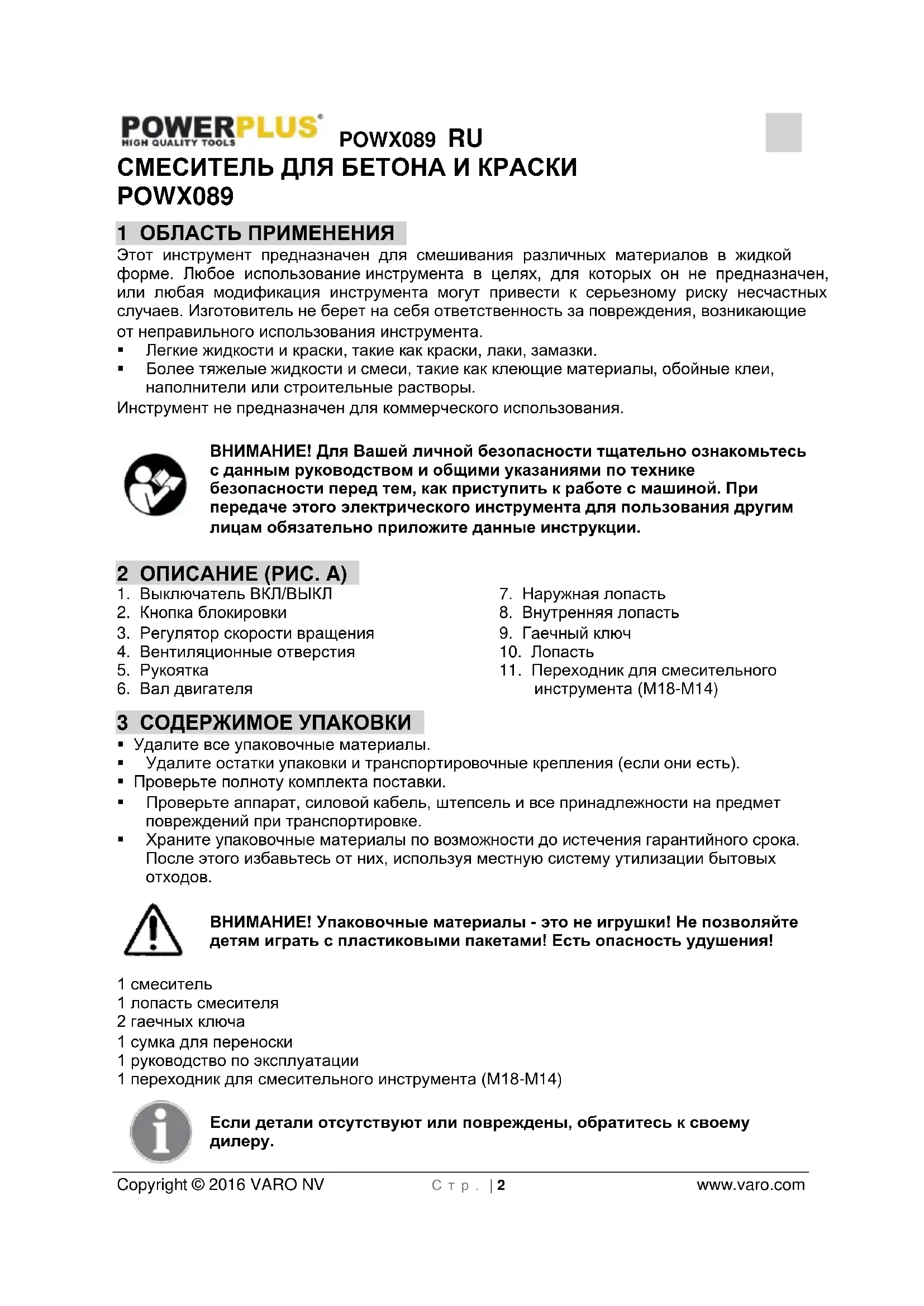 - 15 ДЕКЛАРАЦИЯ СООТВЕТСТВИЯ POWX089 RU Copyright © 2016 VARO NV С т р . | 2 www.varo.com СМЕСИТЕЛЬ ДЛЯ БЕТОНА И КРАСКИ POWX089 1 ОБЛАСТЬ ПРИМЕНЕНИЯ Этот инструмент предназначен для смешивания различных материалов в жидкой форме. Любое использование инструмента в целях, для которых он не предназначен, или любая модификация инструмента могут привести к серьезному риску несчастных случаев. Изготовитель не берет на себя ответственность за повреждения, возникающие от неправильного использования инструмента. Легкие жидкости и краски, такие как краски, лаки, замазки. Более тяжелые жидкости и смеси, такие как клеющие материалы, обойные клеи, наполнители или строительные растворы. Инструмент не предназначен для коммерческого использования. ВНИМАНИЕ! Для Вашей личной безопасности тщательно ознакомьтесь с данным руководством и общими указаниями по технике безопасности перед тем, как приступить к работе с машиной. При передаче этого электрического инструмента для пользования другим лицам обязательно приложите данные инструкции. 2 ОПИСАНИЕ (РИС. A) p. 10