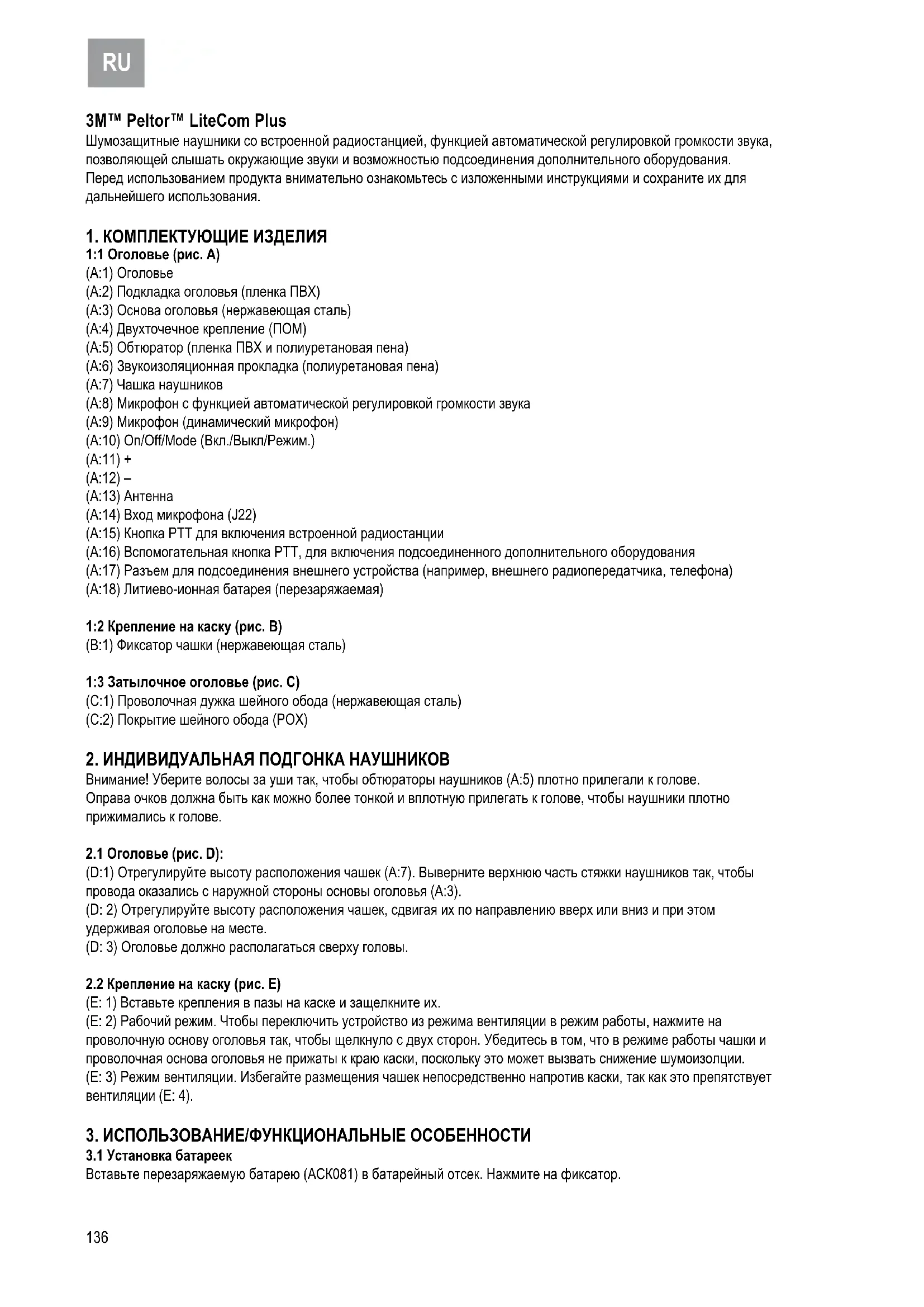 1:1 Оголовье (рис. А) (A:1) Оголовье (A:2) Подкладка оголовья (пленка ПВХ) (A:3) Основа оголовья (нержавеющая сталь) (A:4) Двухточечное крепление (ПОМ) (A:5) Обтюратор (пленка ПВХ и полиуретановая пена) (A:6) Звукоизоляционная прокладка (полиуретановая пена) (A:7) Чашка наушников (A:8) Микрофон с функцией автоматической регулировкой громкости звука (A:9) Микрофон (динамический микрофон) (A:10) On/Off/Mode (Вкл./Выкл/Режим.) (A:11) + (A:12) – (A:13) Антенна (A:14) Вход микрофона (J22) (A:15) Кнопка РТТ для включения встроенной радиостанции (A:16) Вспомогательная кнопка PTT, для включения подсоединенного дополнительного оборудования (A:17) Разъем для подсоединения внешнего устройства (например, внешнего радиопередатчика, телефона) (A:18) Литиево-ионная батарея (перезаряжаемая) 1:2 Крепление на каску (рис. B) (B:1) Фиксатор чашки (нержавеющая сталь) 1:3 Затылочное оголовье (рис. С) (C:1) Проволочная дужка шейного обода (нержавеющая сталь) (C:2) Покрытие шейного обода (POX)
