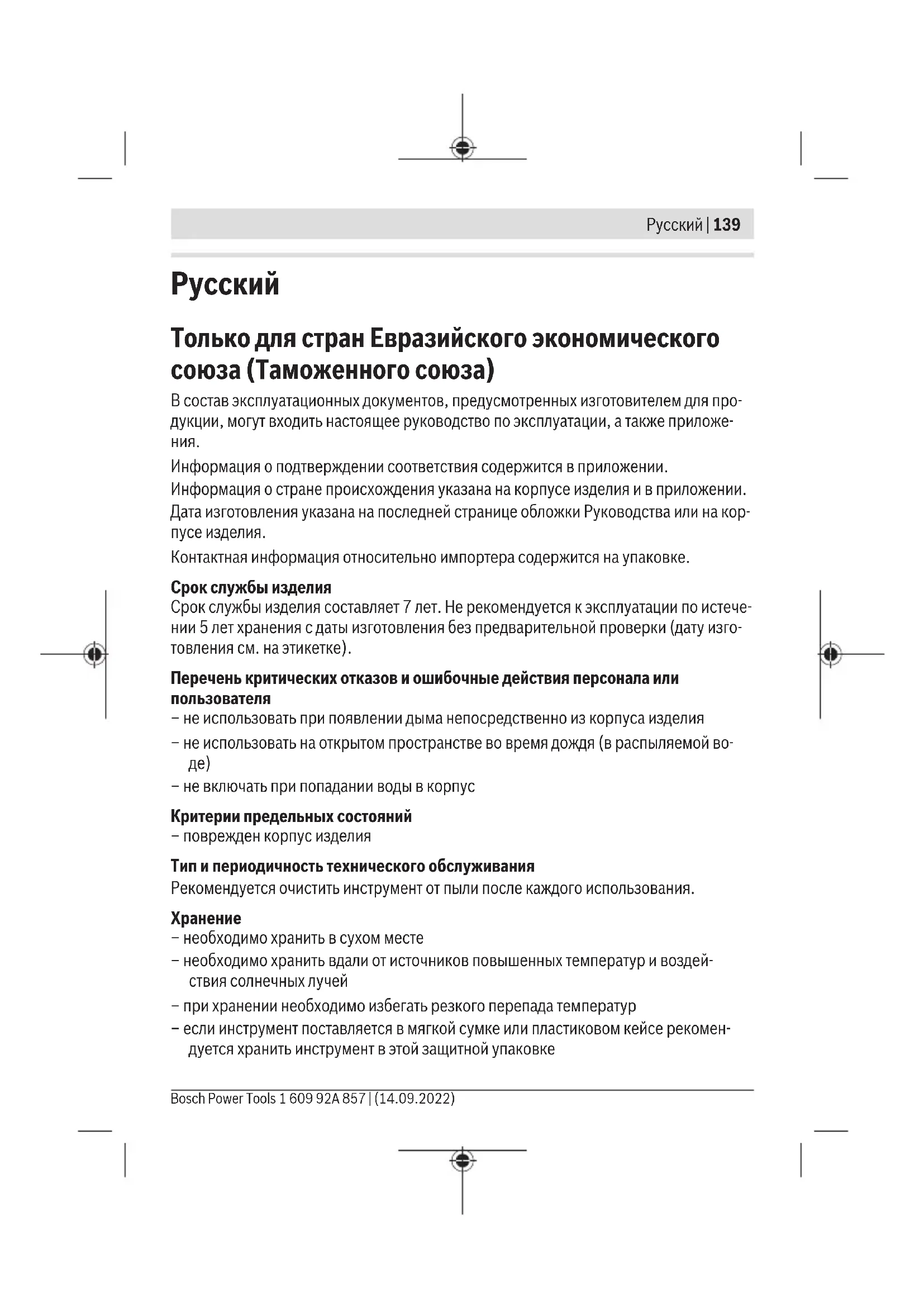 – необходимо хранить в сухом месте – необходимо хранить вдали от источников повышенных температур и воздей- ствия солнечных лучей – при хранении необходимо избегать резкого перепада температур – если инструмент поставляется в мягкой сумке или пластиковом кейсе рекомен- дуется хранить инструмент в этой защитной упаковке Bosch Power Tools 1 609 92A 857 | (14.09.2022)140 | Русский – подробные требования к условиям хранения смотрите в ГОСТ 15150-69 (Усло- вие 1) Транспортировка – категорически не допускается падение и любые механические воздействия на упаковку при транспортировке – при разгрузке/погрузке не допускается использование любого вида техники, ра- ботающей по принципу зажима упаковки – подробные требования к условиям транспортировки смотрите в ГОСТ 15150-69 (Условие 5) Указания по технике безопасности Для обеспечения безопасной и надежной работы с измери- тельным инструментом должны быть прочитаны и соблю- даться все инструкции. Использование измерительного инструмента не в соответствии с настоящими указаниями чревато повреждением интегрированных защитных механиз- мов. Никогда не изменяйте до неузнаваемости предупредительные таблички на измерительном инструменте. ХОРОШО СОХРАНИТЕ ЭТИ ИНСТРУКЦИИ И ПЕРЕДАВАЙТЕ ИХ ВМЕСТЕ С ПЕРЕДАЧЕЙ ИЗМЕРИТЕЛЬНОГО ИНСТРУМЕНТА. u Осторожно – применение инструментов для обслуживания или юстировки или процедур техобслуживания, кроме указанных здесь, может привести к опасному воздействию излучения. u Измерительный инструмент поставляется с предупредительной табличкой лазерного излучения (показана на странице с изображением измерительно- го инструмента). u Если текст предупредительной таблички лазерного излучения не на Вашем родном языке, перед первым запуском в эксплуатацию заклейте ее наклей- кой на Вашем родном языке, которая входит в объем поставки. Не направляйте луч лазера на людей или животных и сами не смотрите на прямой или отражаемый луч лазера. Этот луч мо- жет слепить людей, стать причиной несчастного случая или повре- дить глаза. u В случае попадания лазерного луча в глаз глаза нужно намеренно закрыть и немедленно отвернуться от луча. u Не меняйте ничего в лазерном устройстве. 1 609 92A 857 | (14.09.2022) Bosch Power ToolsРусский | 141 u Не используйте очки для работы с лазерным инструментом (принадлеж- ность) в качестве защитных очков. Очки для работы с лазерным инструментом обеспечивают лучшее распознавание лазерного луча, но не защищают от лазер- ного излучения. u Не используйте очки для работы с лазерным инструментом (принадлеж- ность) в качестве солнцезащитных очков или за рулем. Очки для работы с ла- зером не обеспечивают защиту от УФ-излучения и мешают правильному цвето- восприятию. u Ремонт измерительного инструмента разрешается выполнять только квали- фицированному персоналу и только с использованием оригинальных запча- стей. Этим обеспечивается безопасность измерительного инструмента. u Не позволяйте детям пользоваться лазерным измерительным инструмен- том без присмотра. Дети могут по неосторожности ослепить себя или посто- ронних людей. u Не работайте с измерительным инструментом во взрывоопасной среде, по- близости от горючих жидкостей, газов и пыли. В измерительном инструменте могут образоваться искры, от которых может воспламениться пыль или пары. Описание продукта и услуг Пожалуйста, соблю