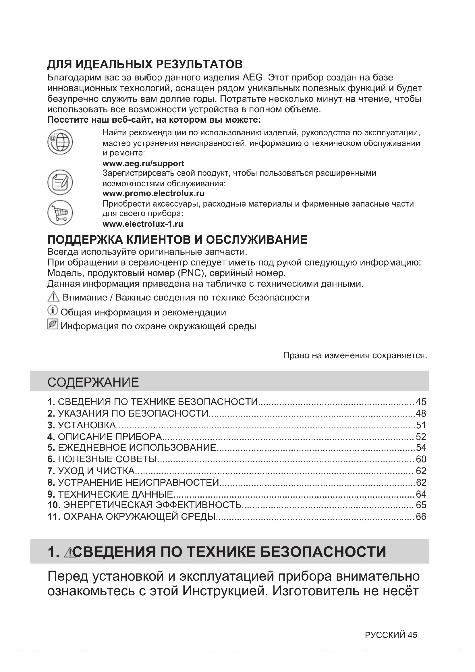 Recyceln Sie Materialien mit dem Symbol . Entsorgen Sie die Verpackung in den entsprechenden Recyclingbehältern. Recyceln Sie zum Umwelt- und Gesundheitsschutz elektrische und elektronische Geräte. Entsorgen Sie Geräte mit diesem Symbol nicht mit dem Hausmüll. Bringen Sie das Gerät zu Ihrer örtlichen Sammelstelle oder wenden Sie sich an Ihr Gemeindeamt. 44 DEUTSCHДЛЯ ИДЕАЛЬНЫХ РЕЗУЛЬТАТОВ Благодарим вас за выбор данного изделия AEG. Этот прибор создан на базе инновационных технологий, оснащен рядом уникальных полезных функций и будет безупречно служить вам долгие годы. Потратьте несколько минут на чтение, чтобы использовать все возможности устройства в полном объеме. Посетите наш веб-сайт, на котором вы можете:Найти рекомендации по использованию изделий, руководства по эксплуатации,мастер устранения неисправностей, информацию о техническом обслуживаниии ремонте:www.aeg.ru/supportЗарегистрировать свой продукт, чтобы пользоваться расширеннымивозможностями обслуживания:www.promo.electrolux.ruПриобрести аксессуары, расходные материалы и фирменные запасные частидля своего прибора:www.electrolux-1.ru ПОДДЕРЖКА КЛИЕНТОВ И ОБСЛУЖИВАНИЕ Всегда используйте оригинальные запчасти. При обращении в сервис-центр следует иметь под рукой следующую информацию: Модель, продуктовый номер (PNC), серийный номер. Данная информация приведена на табличке с техническими данными. Внимание / Важные сведения по технике безопасности Общая информация и рекомендации Информация по охране окружающей среды Право на изменения сохраняется.