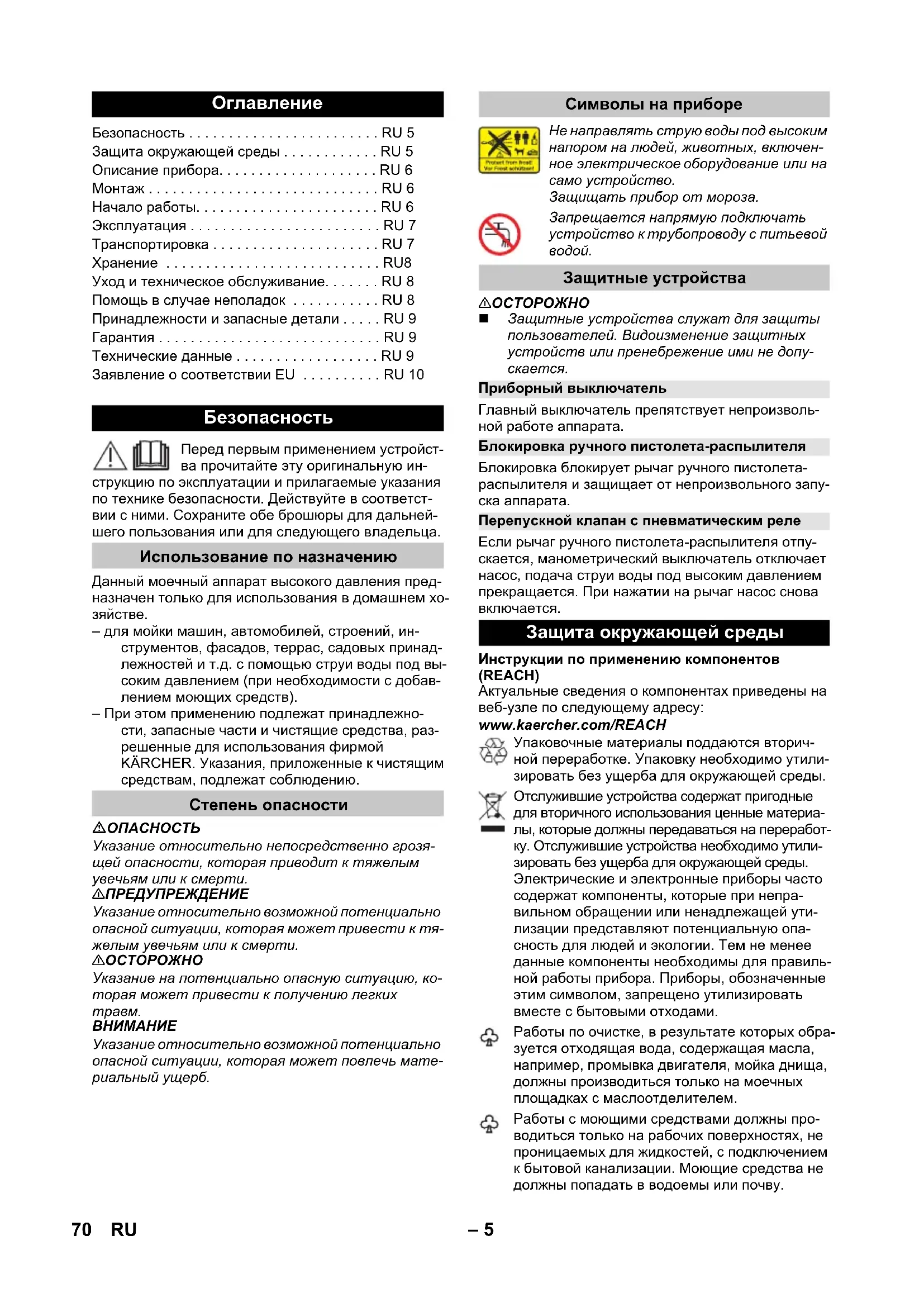 Безопасность . . . . . . . . . . . . . . . . . . . . . . . . RU 5 Защита окружающей среды . . . . . . . . . . . . RU 5 Описание прибора. . . . . . . . . . . . . . . . . . . . RU 6 Монтаж . . . . . . . . . . . . . . . . . . . . . . . . . . . . . RU 6 Начало работы. . . . . . . . . . . . . . . . . . . . . . . RU 6 Эксплуатация . . . . . . . . . . . . . . . . . . . . . . . . RU 7 Транспортировка . . . . . . . . . . . . . . . . . . . . . RU 7 Хранение . . . . . . . . . . . . . . . . . . . . . . . . . . . RU8 Уход и техническое обслуживание. . . . . . . RU 8 Помощь в случае неполадок . . . . . . . . . . . RU 8 Принадлежности и запасные детали . . . . . RU 9 Гарантия . . . . . . . . . . . . . . . . . . . . . . . . . . . . RU 9 Технические данные . . . . . . . . . . . . . . . . . . RU 9 Заявление о соответствии ЕU . . . . . . . . . . RU 10 Безопасность Использование по назначению Степень опасности Символы на приборе Не направлять струю воды под высоким напором на людей, животных, включен- ное электрическое оборудование или на само устройство. Защищать прибор от мороза. Запрещается напрямую подключать устройство к трубопроводу с питьевой