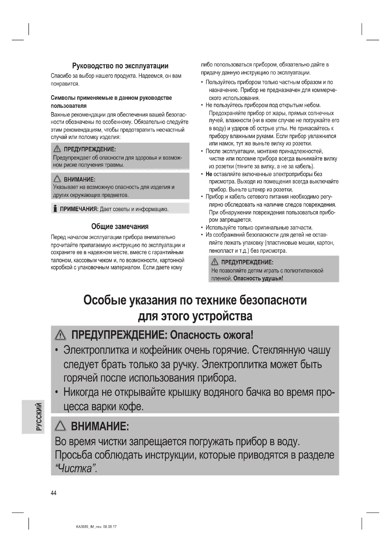 Во время чистки запрещается погружать прибор в воду. Просьба соблюдать инструкции, которые приводятся в разделе “Чистка”.45 KA3689_IM_neu 08.08.17