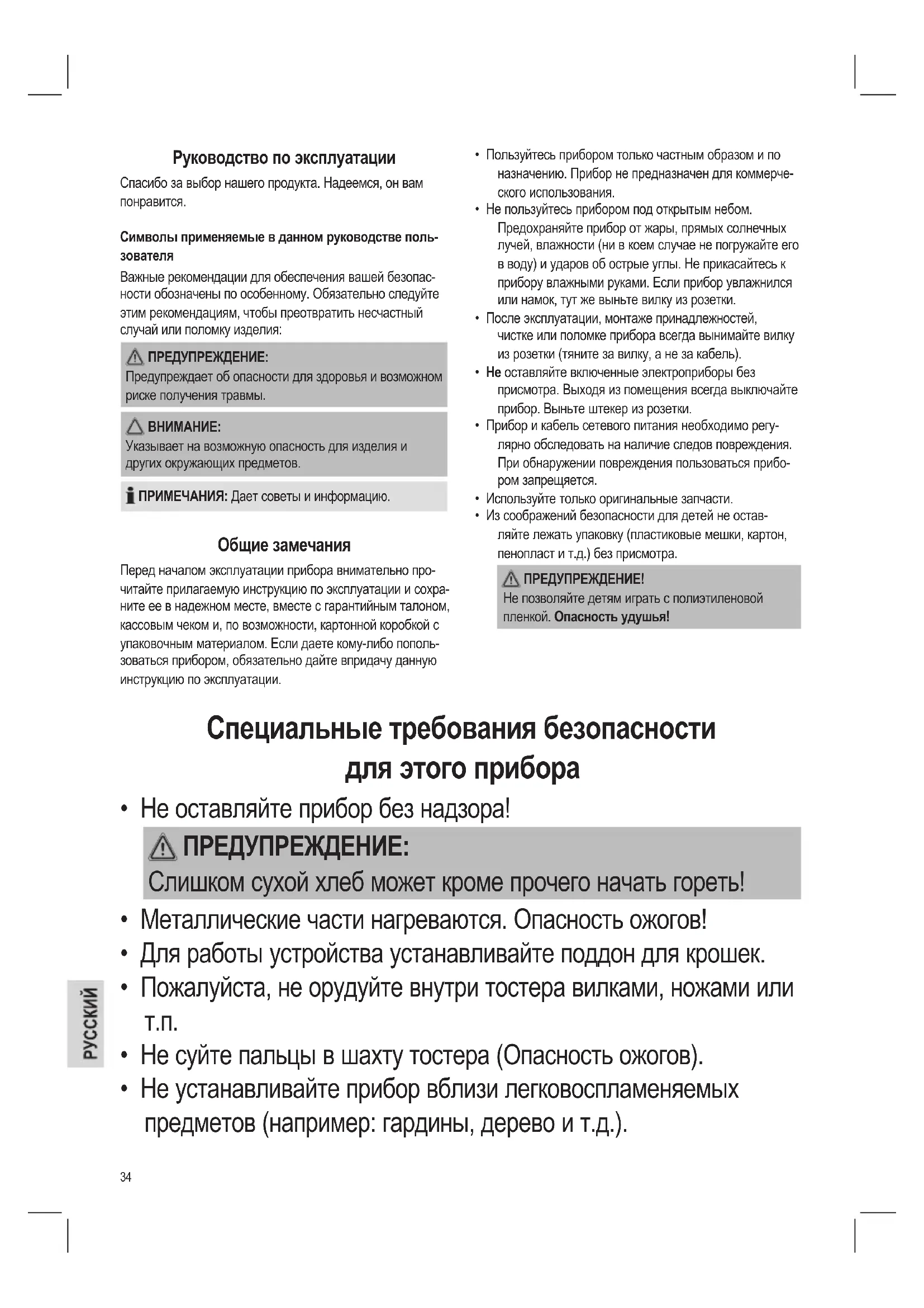- Не суйте пальцы в шахту тостера (Опасность ожогов).