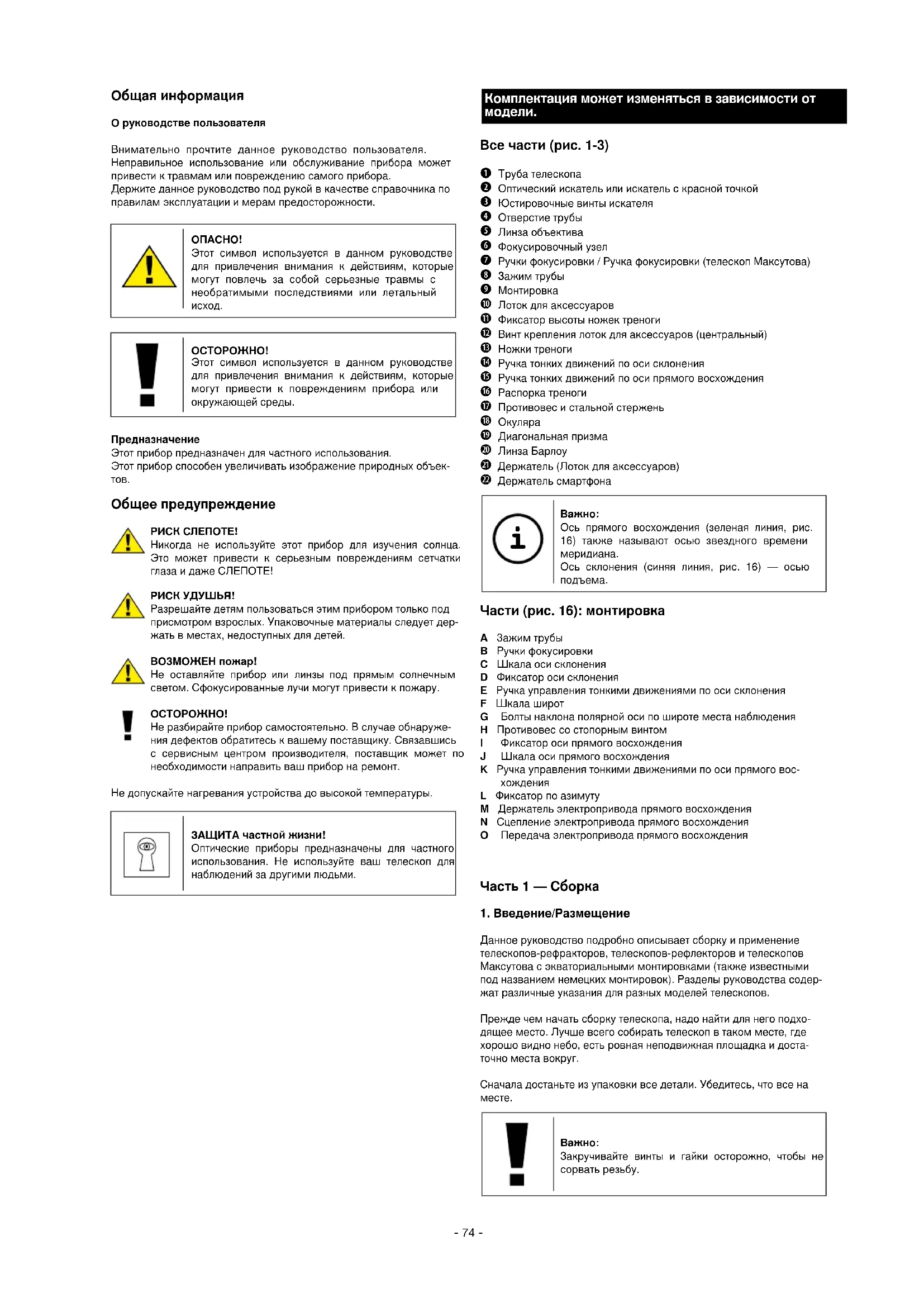 Данное руководство подробно описывает сборку и применение телескопов-рефракторов, телескопов-рефлекторов и телескопов Максутова с экваториальными монтировками (также известными под названием немецких монтировок). Разделы руководства содер- жат различные указания для разных моделей телескопов. Прежде чем начать сборку телескопа, надо найти для него подхо- дящее место. Лучше всего собирать телескоп в таком месте, где хорошо видно небо, есть ровная неподвижная площадка и доста- точно места вокруг. Сначала достаньте из упаковки все детали. Убедитесь, что все на