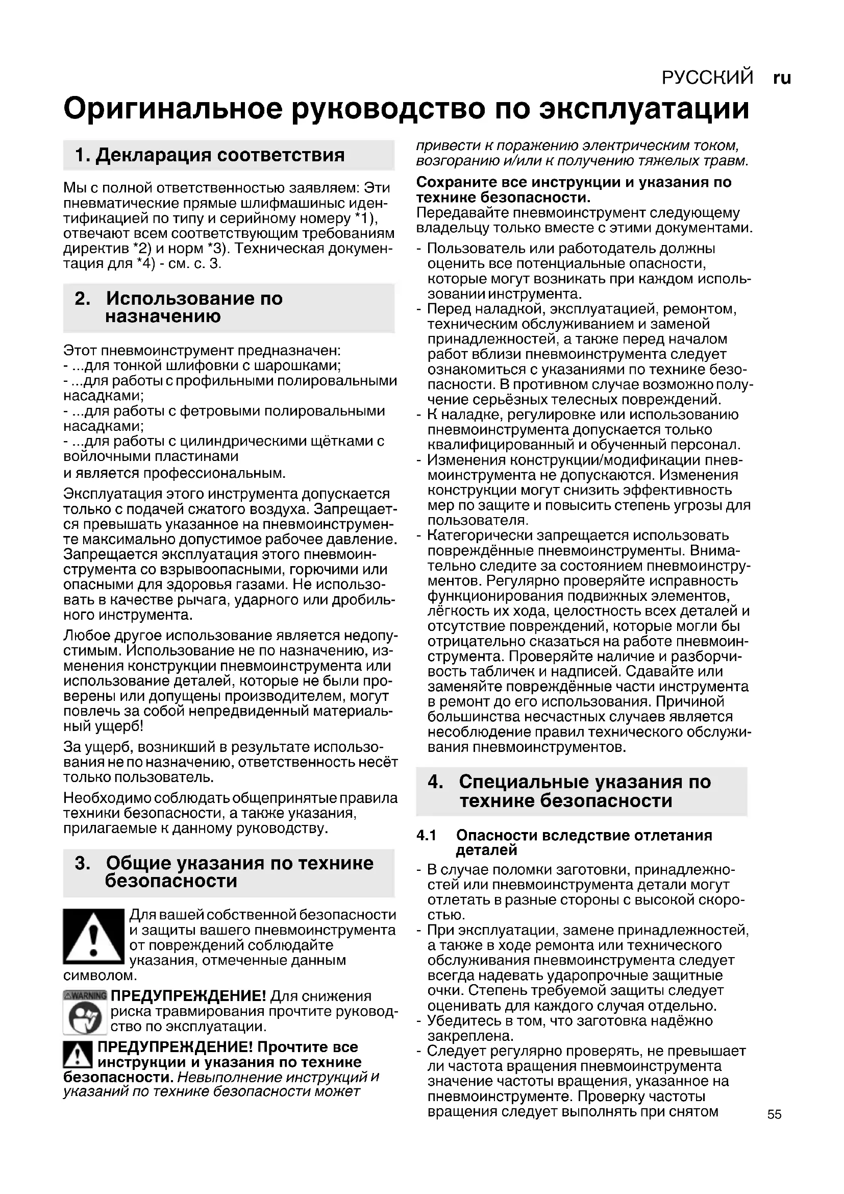 Оригинальное руководство по эксплуатации Мы с полной ответственностью заявляем: Эти пневматические прямые шлифмашиныс иден- тификацией по типу и серийному номеру *1), отвечают всем соответствующим требованиям директив *2) и норм *3). Техническая докумен- тация для *4) - см. с. 3. Этот пневмоинструмент предназначен: - ...для тонкой шлифовки с шарошками; - ...для работы с профильными полировальными