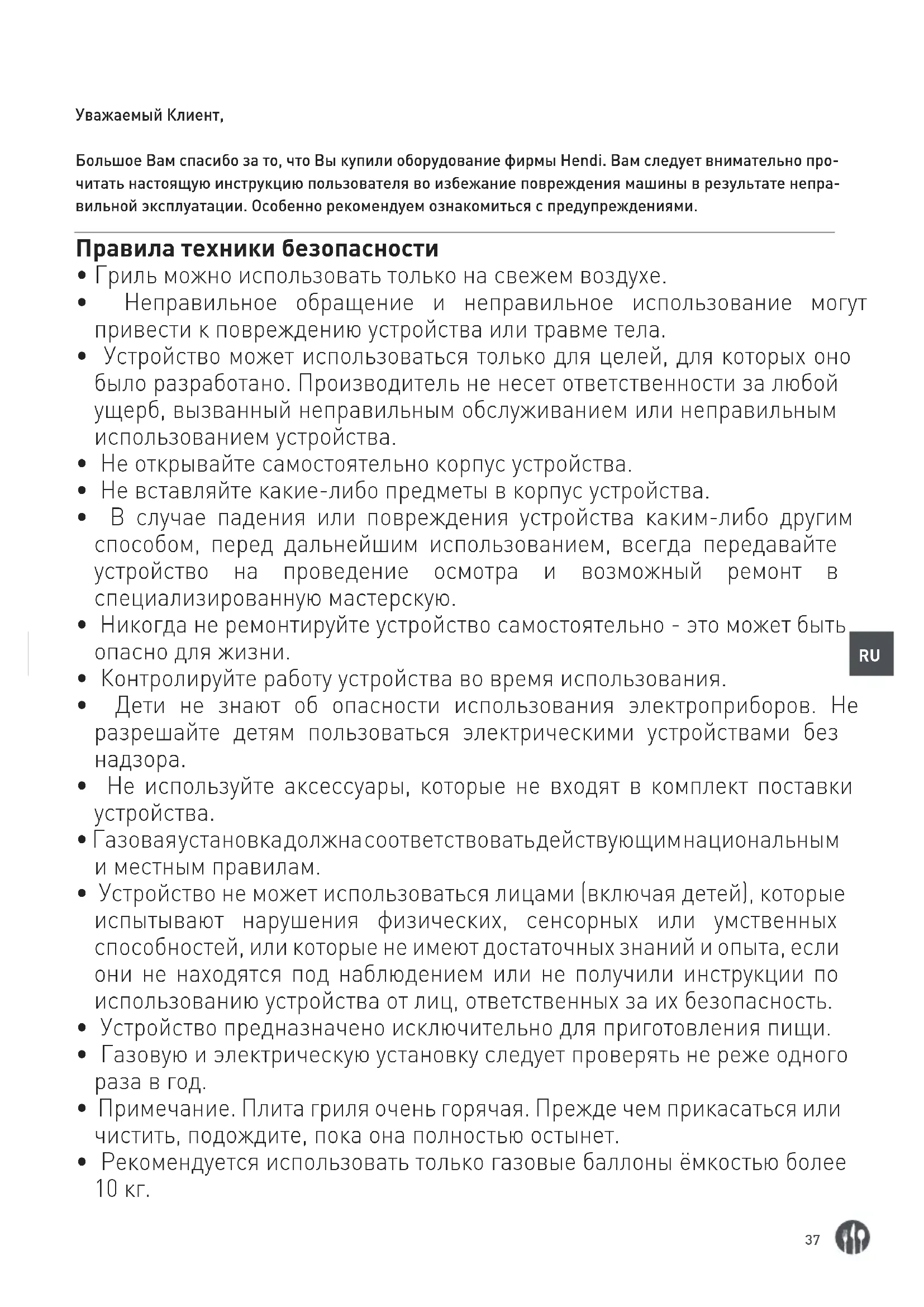 Уважаемый Клиент, Большое Вам спасибо за то, что Вы купили оборудование фирмы Hendi. Вам следует внимательно про- читать настоящую инструкцию пользователя во избежание повреждения машины в результате непра- вильной эксплуатации. Особенно рекомендуем ознакомиться с предупреждениями. Правила техники безопасности