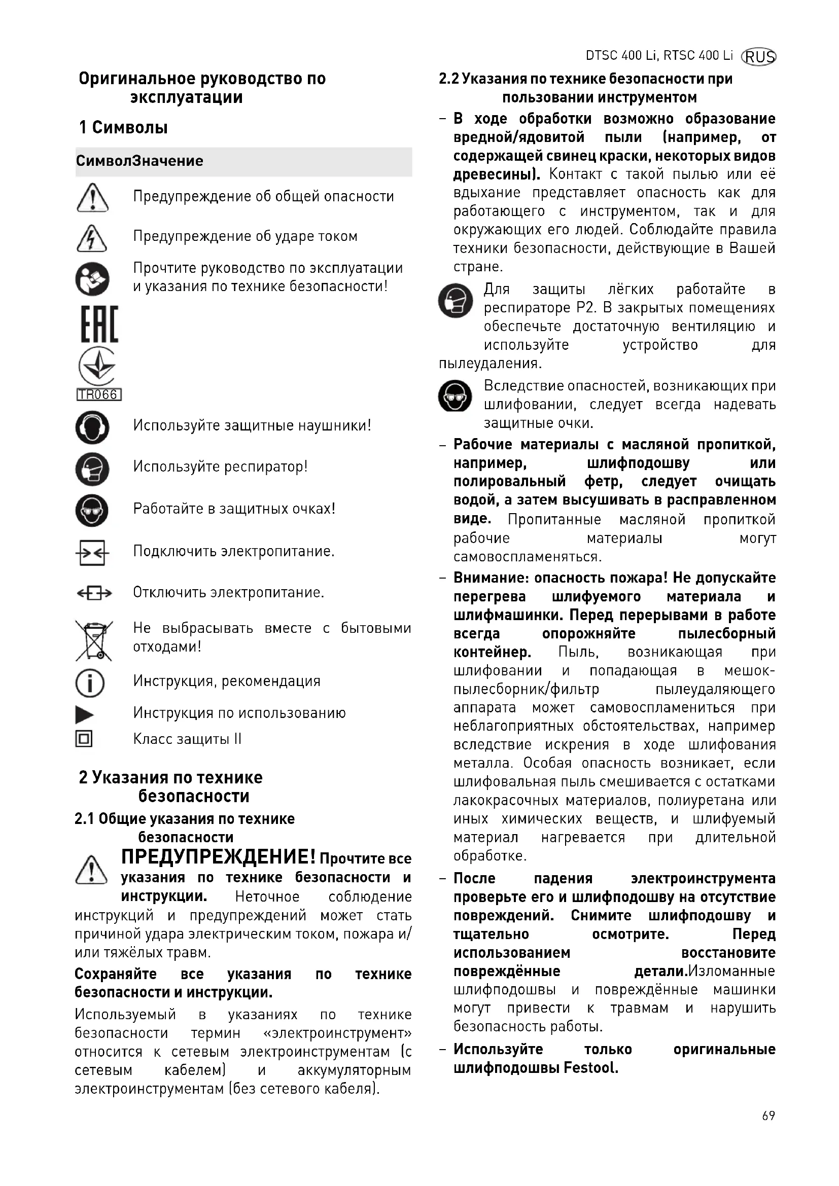 Используйте только оригинальные шлифподошвы Festool. СимволЗначение Предупреждение об общей опасности Предупреждение об ударе током Прочтите руководство по эксплуатации и указания по технике безопасности! Используйте защитные наушники! Используйте респиратор! Работайте в защитных очках! Подключить электропитание. Отключить электропитание. Не выбрасывать вместе с бытовыми