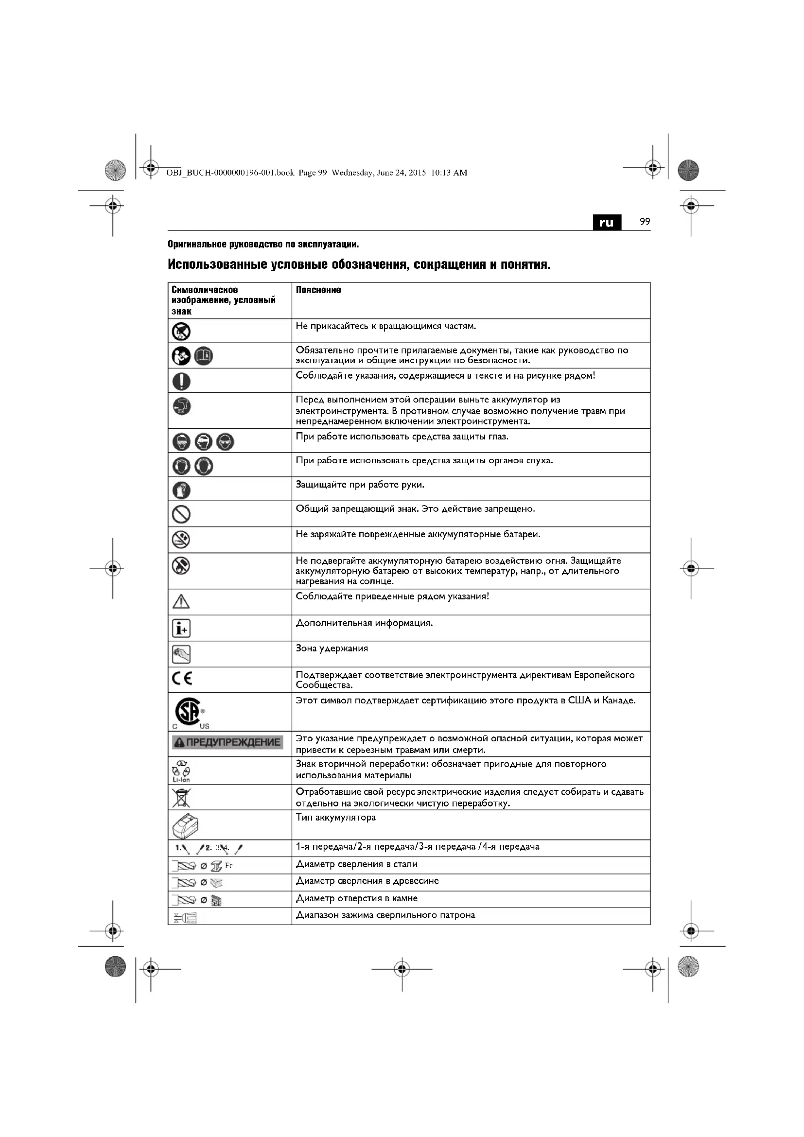 Не прикасайтесь к вращающимся частям. Обязательно прочтите прилагаемые документы, такие как руководство по эксплуатации и общие инструкции по безопасности. Соблюдайте указания, содержащиеся в тексте и на рисунке рядом! Перед выполнением этой операции выньте аккумулятор из электроинструмента. В противном случае возможно получение травм при непреднамеренном включении электроинструмента. При работе использовать средства защиты глаз. При работе использовать средства защиты органов слуха. Защищайте при работе руки. Общий запрещающий знак. Это действие запрещено. Не заряжайте поврежденные аккумуляторные батареи. Не подвергайте аккумуляторную батарею воздействию огня. Защищайте аккумуляторную батарею от высоких температур, напр., от длительного нагревания на солнце. Соблюдайте приведенные рядом указания! Дополнительная информация. Зона удержания Подтверждает соответствие электроинструмента директивам Европейского Сообщества. Этот символ подтверждает сертификацию этого продукта в США и Канаде. Это указание предупреждает о возможной опасной ситуации, которая может привести к серьезным травмам или смерти. Знак вторичной переработки: обозначает пригодные для повторного использования материалы Отработавшие свой ресурс электрические изделия следует собирать и сдавать отдельно на экологически чистую переработку. Тип аккумулятора 1-я передача/2-я передача/3-я передача /4-я передача Диаметр сверления в стали Диаметр сверления в древесине Диаметр отверстия в камне Диапазон зажима сверлильного патрона