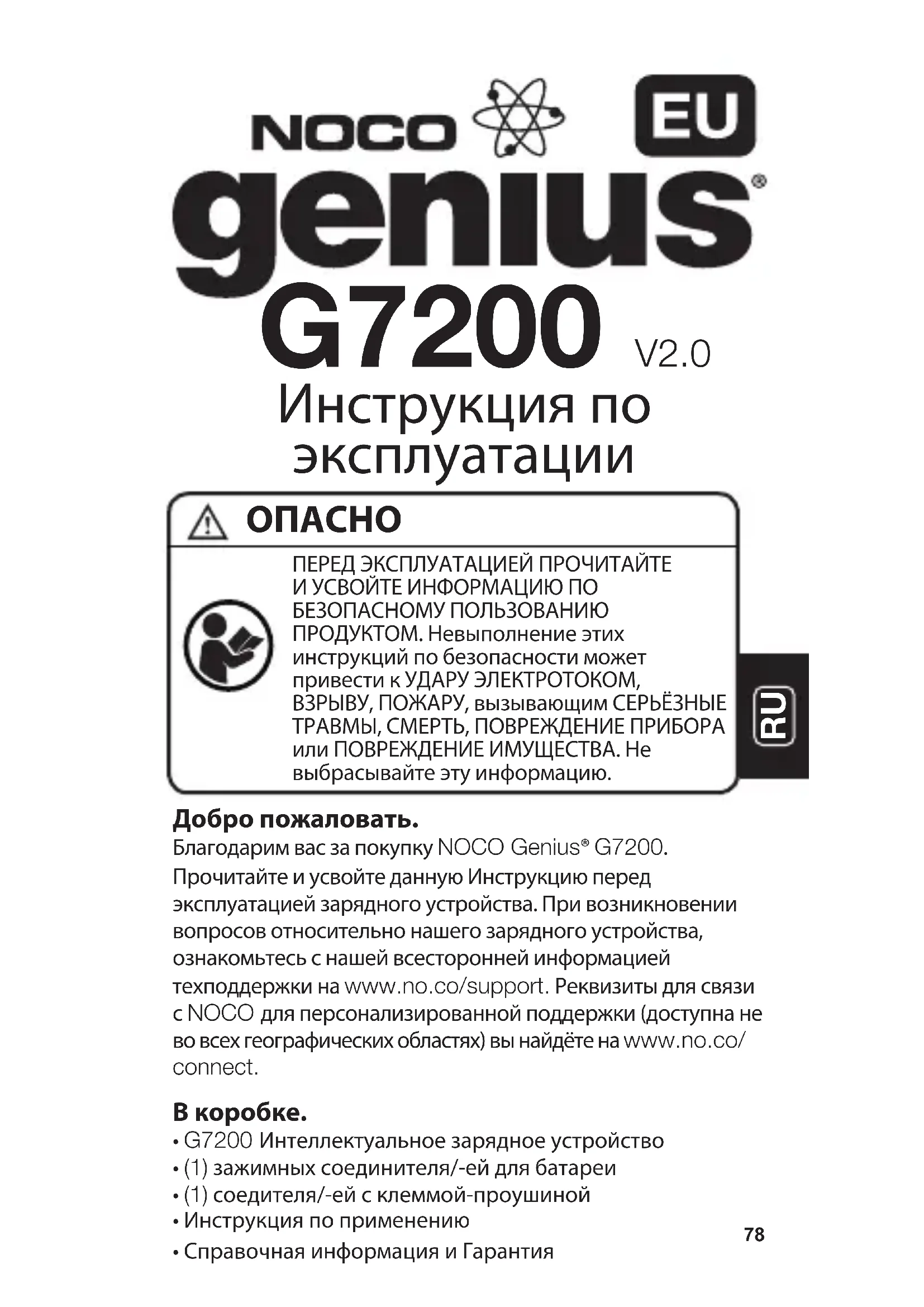 Добро пожаловать. Благодарим вас за покупку NOCO Genius® G7200. Прочитайте и усвойте данную Инструкцию перед эксплуатацией зарядного устройства. При возникновении вопросов относительно нашего зарядного устройства, ознакомьтесь с нашей всесторонней информацией техподдержки на www.no.co/support. Реквизиты для связи с NOCO для персонализированной поддержки (доступна не во всех географических областях) вы найдёте на www.no.co/connect.