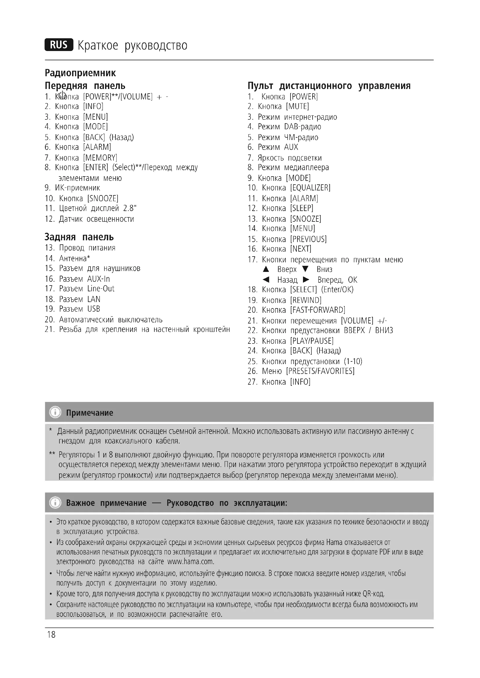 Регуляторы 1 и 8 выполняют двойную функцию. При повороте регулятора изменяется громкость или осуществляется переход между элементами меню. При нажатии этого регулятора устройство переходит в ждущий режим (регулятор громкости) или подтверждается выбор (регулятор перехода между элементами меню). Важное примечание — Руководство по эксплуатации:
