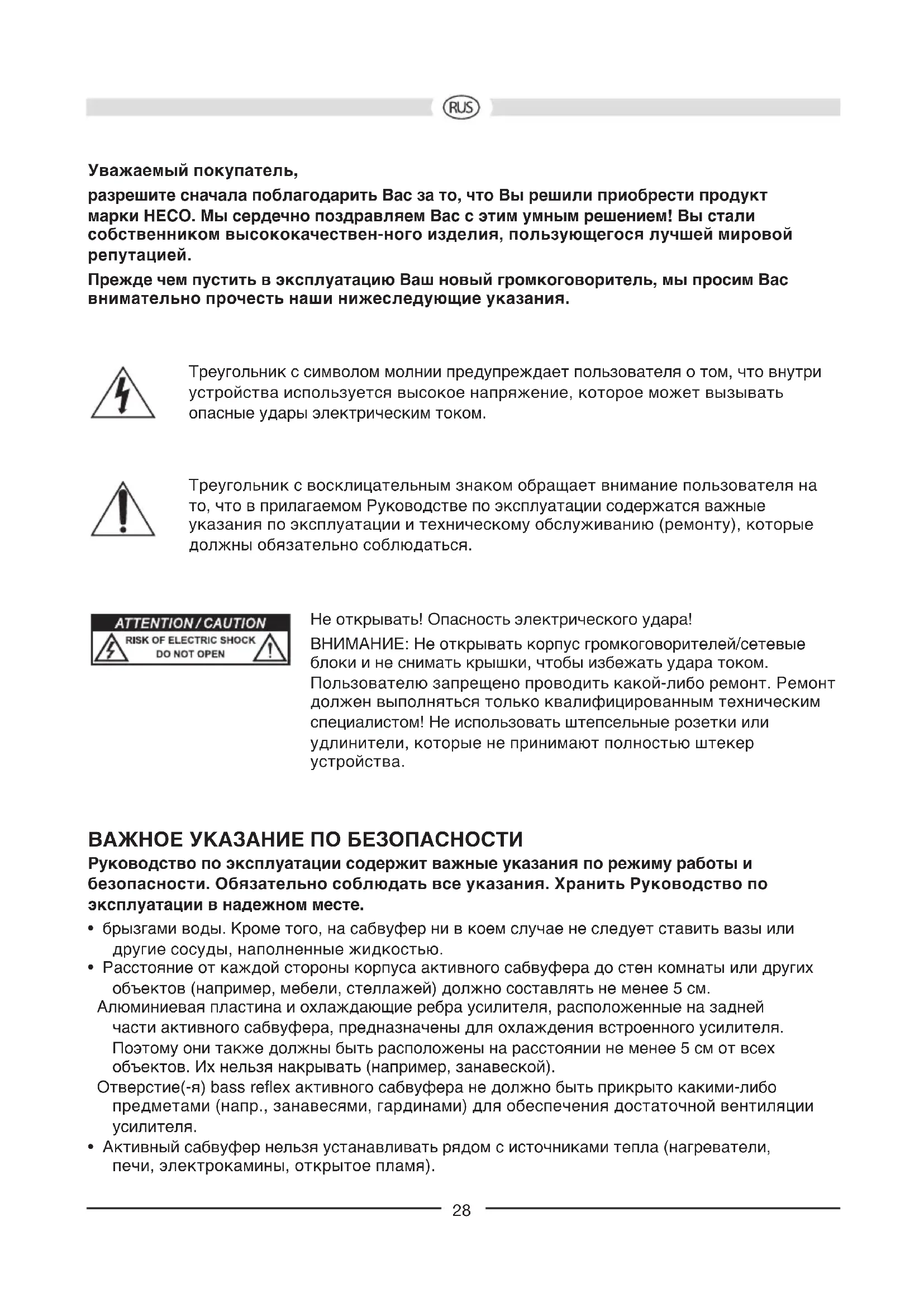 Fördelningsfrekvenskontroll (2) Härmed bör du ställa in den högsta frekvensen som subwoofern kan arbeta med. I kombination med hyllhögtalare bör frekvensen ställas in på 50 Hz – 150 Hz, om stående högtalare används kan en inställning mellan 50 Hz – 100 Hz rekommenderas. Fasreglering (3) I normalfall ska fasregleringen stå på 0°. I vissa fall kan det vara lämpligt att variera fasen mellan 0° och 180° (t ex vid långt avstånd mellan subwoofern och front-satelliterna eller vid dålig akustik i rummet). Generellt gäller: Fasomkopplaren står i rätt läge när grundtonen låter mest naturlig. Bass EQ-reglage (4) Nivån för det undre basområdet kring ungefär 35 Hz (New Phalanx 302A)/40 Hz (New Phalanx 202A) kan varieras med 0 - 6 dB med hjälp av detta reglage. Därmed kan de låga bastonerna lätt anpassas till rummet och till dina individuella önskemål. Säkring (10) Endast säkringar av den typ som anges i den påtryckta triangeln bredvid säkringshållaren på förstärkarens baksida får användas. SKÖTSEL Torka av ytorna med ett rengöringsmedel för hushållsbruk, använd alltså aldrig möbelpolish eller liknande. TEKNISKA DATA New Phalanx 302A New Phalanx 202A Konguration: Aktiv subwoofer Aktiv subwoofer Bestyckning: 30 cm woofer 30 cm bass-radiator 20 cm woofer 20 cm bass-radiator Utgångseffekt RMS/Max.: 250 / 400 W 220 / 350 W Frekvensområde: 18 – 150 Hz 20 – 150 Hz Delningsfrekvens: 50 – 150 Hz inställbar 50 – 150 Hz inställbar Mått (BxHxD): 380 x 442 x 435 mm 270 x 285 x 305 mm Tillbehör: Nätkabel Nätkabel VI FÖRBEHÅLLER OSS RÄTTEN TILL TEKNISKA ÄNDRINGAR.28 Уважаемый покупатель, разрешите сначала поблагодарить Вас за то, что Вы решили приобрести продукт марки HECO. Мы сердечно поздравляем Вас с этим умным решением! Вы стали собственником высококачествен-ного изделия, пользующегося лучшей мировой репутацией. Прежде чем пустить в эксплуатацию Ваш новый громкоговоритель, мы просим Вас внимательно прочесть наши нижеследующие указания. Треугольник с символом молнии предупреждает пользователя о том, что внутри устройства используется высокое напряжение, которое может вызывать опасные удары электрическим током. Треугольник с восклицательным знаком обращает внимание пользователя на то, что в прилагаемом Руководстве по эксплуатации содержатся важные указания по эксплуатации и техническому обслуживанию (ремонту), которые должны обязательно соблюдаться. Не открывать! Опасность электрического удара! ВНИМАНИЕ: Не открывать корпус громкоговорителей/сетевые блоки и не снимать крышки, чтобы избежать удара током. Пользователю запрещено проводить какой-либо ремонт. Ремонт должен выполняться только квалифицированным техническим специалистом! Не использовать штепсельные розетки или удлинители, которые не принимают полностью штекер устройства. ВАЖНОЕ УКАЗАНИЕ ПО БЕЗОПАСНОСТИ Руководство по эксплуатации содержит важные указания по режиму работы и безопасности. Обязательно соблюдать все указания. Хранить Руководство по эксплуатации в надежном месте.