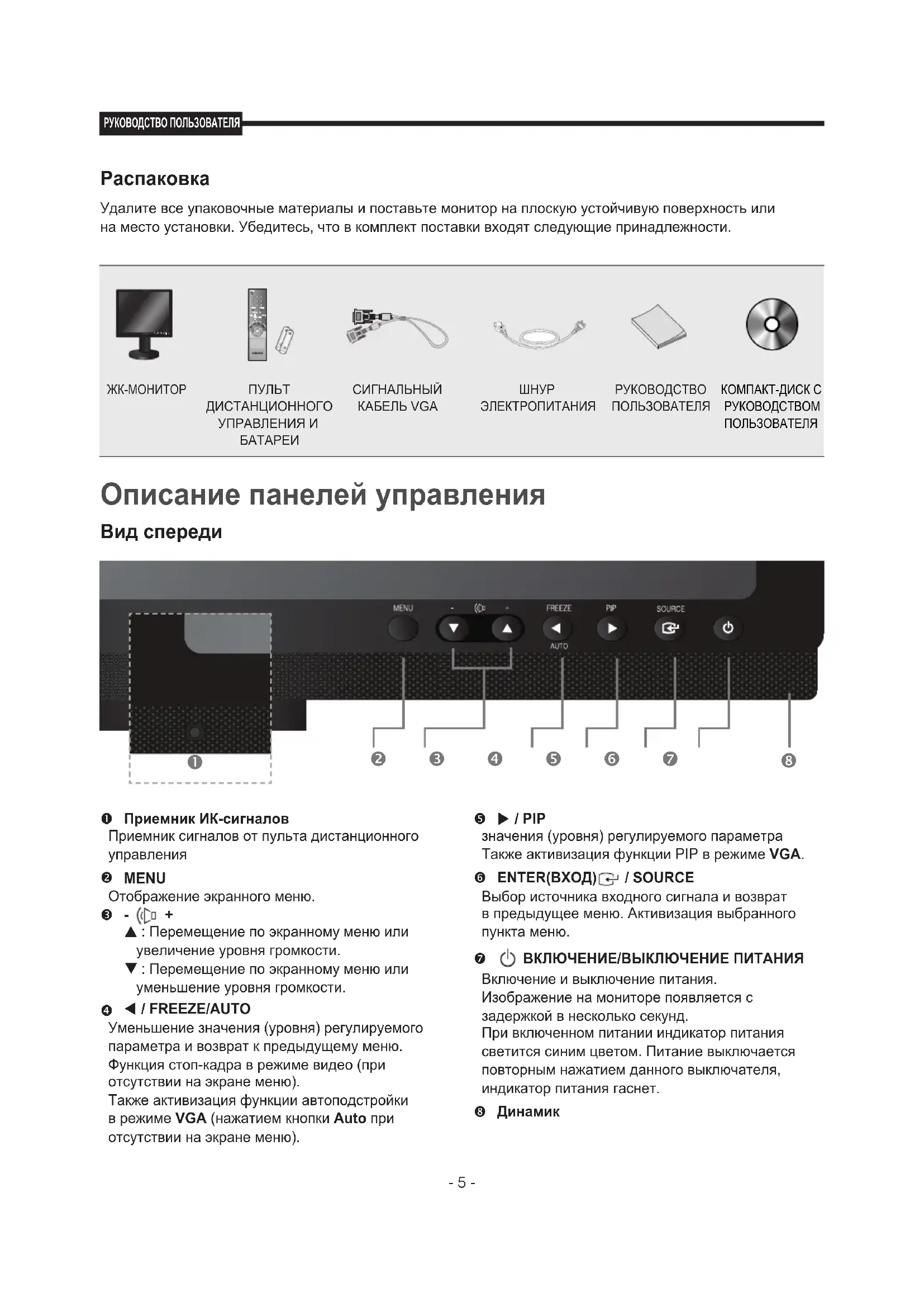 РУКОВОДСТВО ПОЛЬЗОВАТЕЛЯ - 6 -P.MODE – функция доступна в режиме Video A/B и S-Video. Используется для выбора предварительно настроенного режима изображения для монитора или для смены параметров изображения. При нажатии этой кнопки в нижней центральной части экрана отображается текущий режим. Монитор имеет четыре предустановленных на заводе-изготовителе варианта автоматической установки параметров изображения. Для циклического выбора предварительно настроенных режимов повторно нажимайте кнопку. (“Динам.”, “Стандартн.”, “Кино”, “Польз.”) FREEZE – функция доступна в режиме Video A/B и S-Video. Нажмите кнопку для остановки изображения на экране. Снова нажмите кнопку для отмены стоп-кадра. AUTO – функция доступна только в режиме VGA Автоматическая настройка изображения на экране. SOURCE Нажмите кнопку SOURCE для смены источника входного сигнала. Источник выбирается только среди внешних устройств, подключенных в этот момент к монитору.