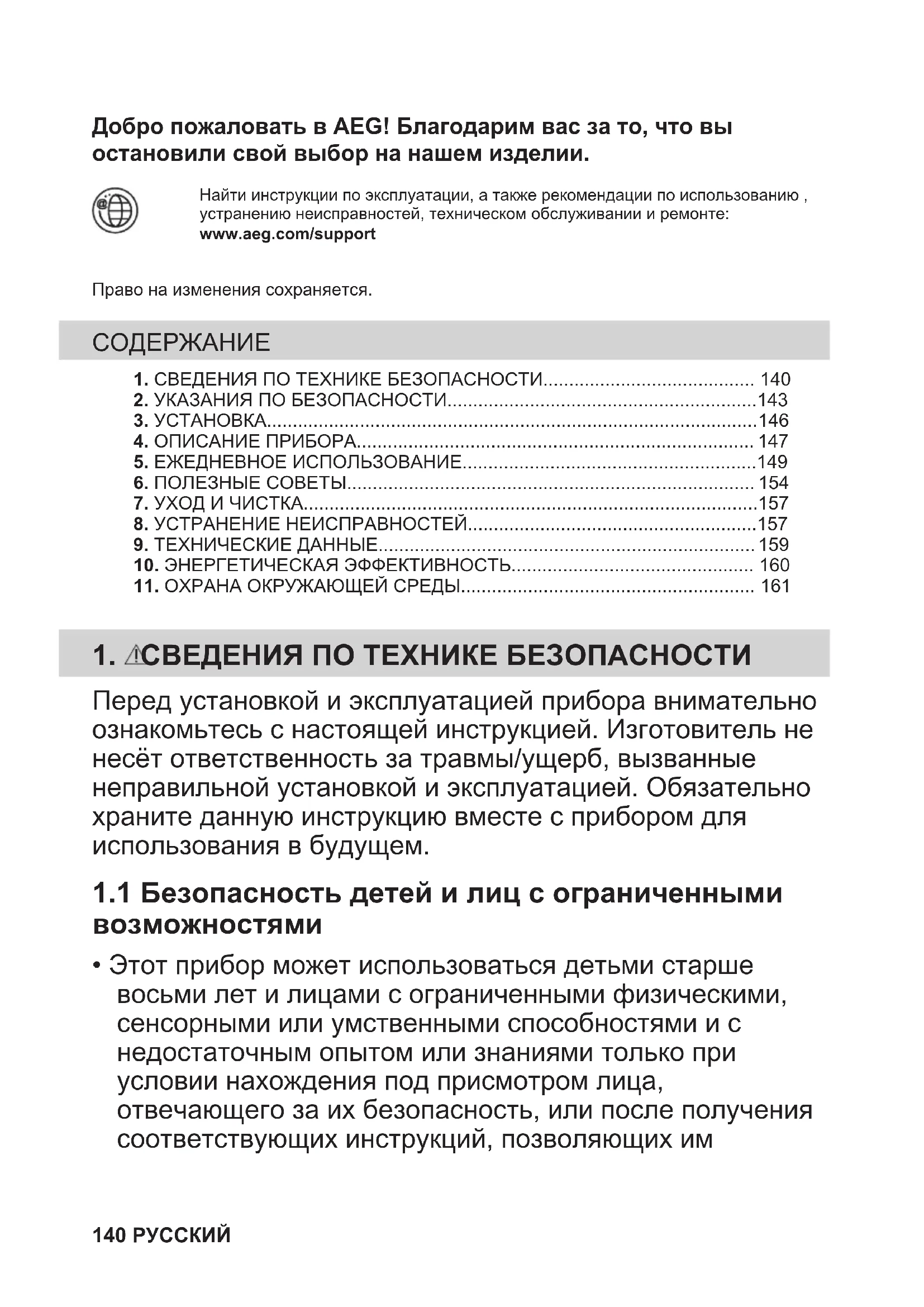 Материалы с символом следует сдавать на переработку. Положите упаковку в соответствующие контейнеры для сбора вторичного сырья. Принимая участие в переработке старого электробытового оборудования, Вы помогаете защитить окружающую среду и здоровье человека. Не выбрасывайте вместе с бытовыми отходами бытовую технику, помеченную символом . Прибор следует доставить в место раздельного накопления и сбора отходов потребления или в пункт сбора использованной бытовой техники для последующей утилизации. РУССКИЙ 161Le damos la bienvenida a AEG. Gracias por elegir nuestro aparato. Obtener consejos, folletos, soluciones a problemas e información de servicio yreparación:www.aeg.com/supportSalvo modificaciones. CONTENIDO 1. INFORMACIÓN SOBRE SEGURIDAD.......................................................1622. INSTRUCCIONES DE SEGURIDAD.......................................................... 165