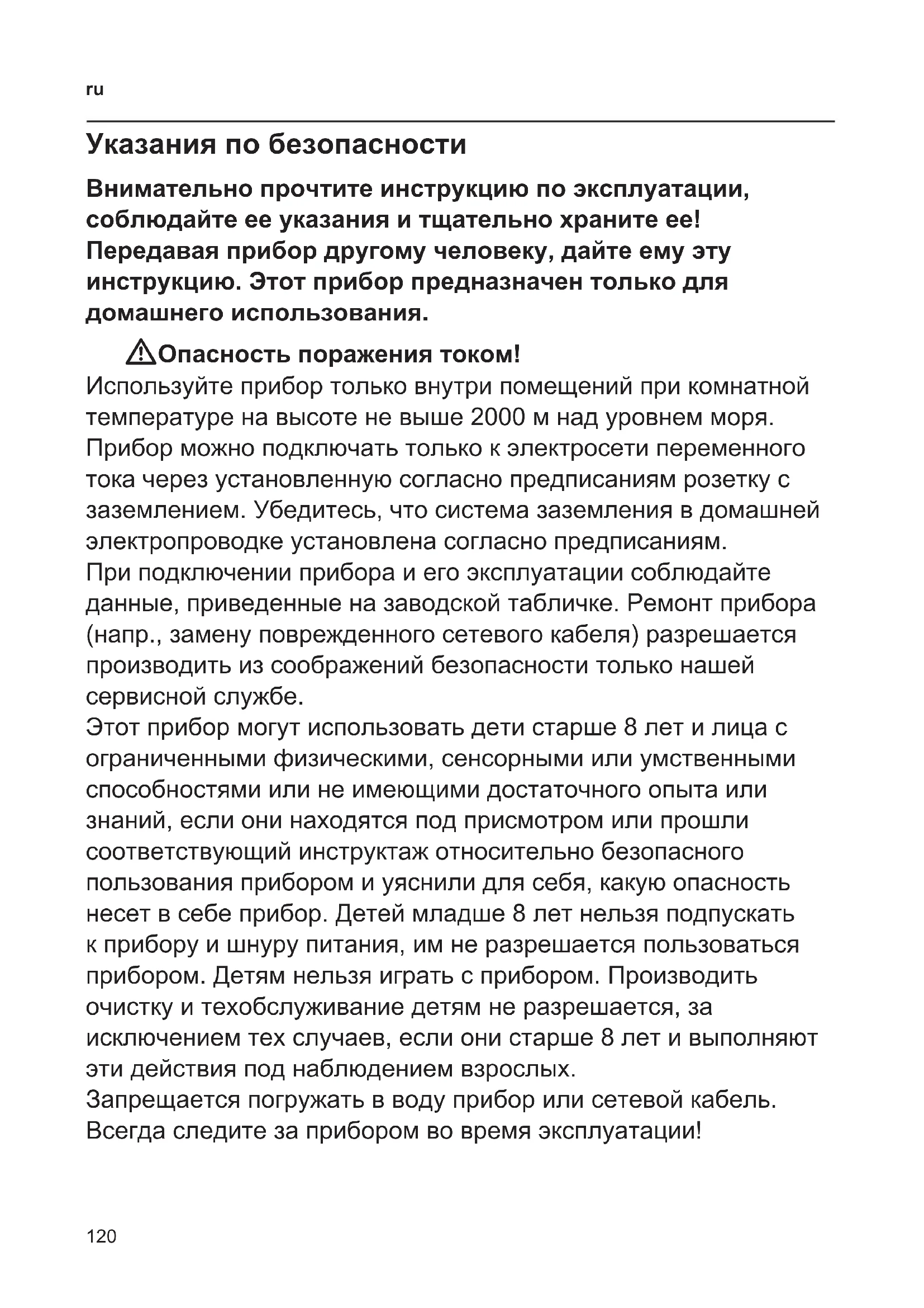 Указания по безопасности Внимательно прочтите инструкцию по эксплуатации, соблюдайте ее указания и тщательно храните ее! Передавая прибор другому человеку, дайте ему эту инструкцию. Этот прибор предназначен только для домашнего использования. WОпасность поражения током! Используйте прибор только внутри помещений при комнатной температуре на высоте не выше 2000 м над уровнем моря. Прибор можно подключать только к электросети переменного тока через установленную согласно предписаниям розетку с заземлением. Убедитесь, что система заземления в домашней электропроводке установлена согласно предписаниям. При подключении прибора и его эксплуатации соблюдайте данные, приведенные на заводской табличке. Ремонт прибора (напр., замену поврежденного сетевого кабеля) разрешается производить из соображений безопасности только нашей сервисной службе. Этот прибор могут использовать дети старше 8 лет и лица с ограниченными физическими, сенсорными или умственными способностями или не имеющими достаточного опыта или знаний, если они находятся под присмотром или прошли соответствующий инструктаж относительно безопасного пользования прибором и уяснили для себя, какую опасность несет в себе прибор. Детей младше 8 лет нельзя подпускать к прибору и шнуру питания, им не разрешается пользоваться прибором. Детям нельзя играть с прибором. Производить очистку и техобслуживание детям не разрешается, за исключением тех случаев, если они старше 8 лет и выполняют эти действия под наблюдением взрослых. Запрещается погружать в воду прибор или сетевой кабель. Всегда следите за прибором во время эксплуатации!121