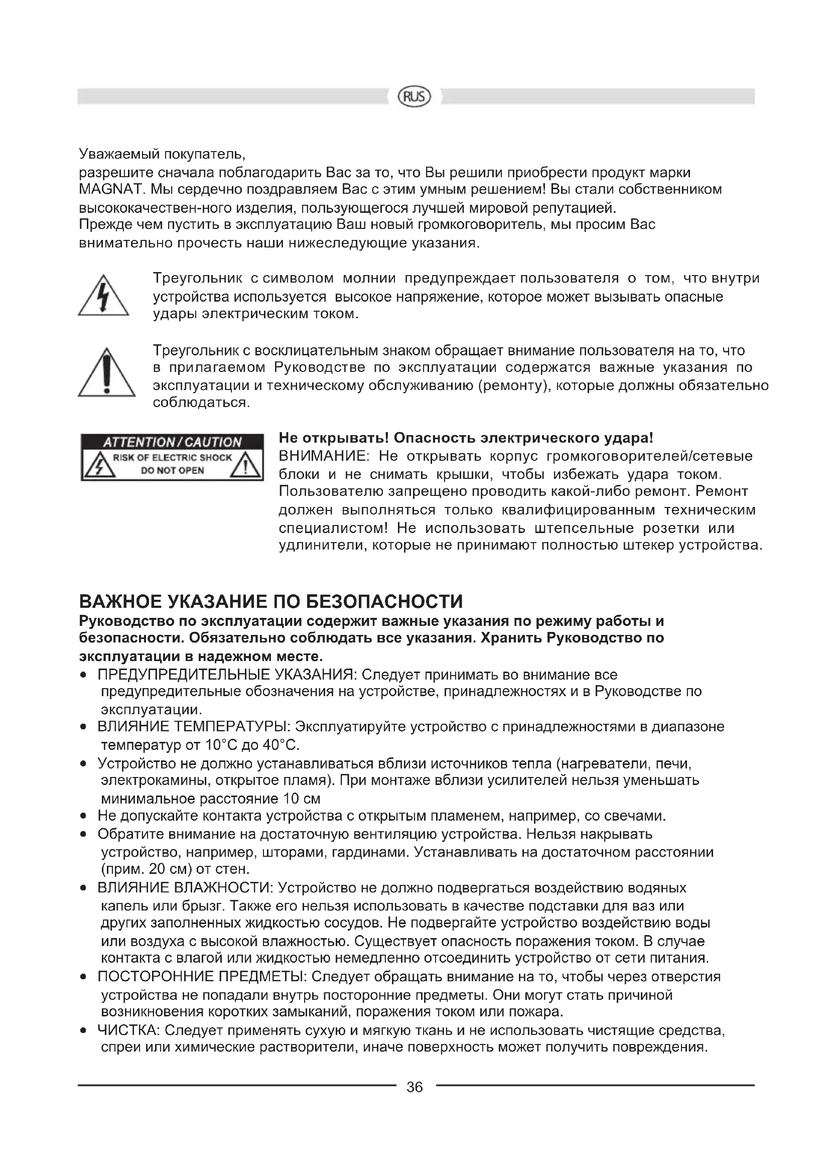 Fördelningsfrekvenskontroll (4) Härmed bör du ställa in den högsta frekvensen som subwoofern kan arbeta med. I kombination med hyllhögtalare bör frekvensen ställas in på 100 Hz – 150 Hz, om stående högtalare används kan en inställning mellan 50 Hz – 100 Hz rekommenderas.35 Fasomkopplare (11) I normalfall ska fasomkopplaren stå på 0°. I vissa fall kan det vara lämpligt om fasen står på 180° (t ex vid långt avstånd mellan subwoofern och front-högtalarna eller vid dålig akustik i rummet). Generellt gäller: Fasomkopplaren står i rätt läge när grundtonen låter fyllig. Säkring (9) Endast säkringar av den typ som anges i den påtryckta triangeln bredvid säkringshållaren på förstärkarens baksida får användas. TEKNISKA DATA Konfiguration: Basreflex, downfire Bestyckning: Drivsteg för 30 cm lång slaglängd Utgångseffekt RMS/Max.: 180 / 360 W Frekvensområde: 18 – 300 Hz Delningsfrekvens: 50 – 150 Hz inställbar Mått (BxHxD): 420 x 545 x 535 mm Tillbehör: Nätkabel VI FÖRBEHÅLLER OSS RÄTTEN TILL TEKNISKA ÄNDRINGAR.36 Уважаемый покупатель, разрешите сначала поблагодарить Вас за то, что Вы решили приобрести продукт марки MAGNAT. Мы сердечно поздравляем Вас с этим умным решением! Вы стали собственником высококачествен-ного изделия, пользующегося лучшей мировой репутацией. Прежде чем пустить в эксплуатацию Ваш новый громкоговоритель, мы просим Вас внимательно прочесть наши нижеследующие указания. Треугольник с символом молнии предупреждает пользователя о том, что внутри устройства используется высокое напряжение, которое может вызывать опасные удары электрическим током. Треугольник с восклицательным знаком обращает внимание пользователя на то, что в прилагаемом Руководстве по эксплуатации содержатся важные указания по эксплуатации и техническому обслуживанию (ремонту), которые должны обязательно соблюдаться. Не открывать! Опасность электрического удара! ВНИМАНИЕ: Не открывать корпус громкоговорителей/сетевые блоки и не снимать крышки, чтобы избежать удара током. Пользователю запрещено проводить какой-либо ремонт. Ремонт должен выполняться только квалифицированным техническим специалистом! Не использовать штепсельные розетки или удлинители, которые не принимают полностью штекер устройства. ВАЖНОЕ УКАЗАНИЕ ПО БЕЗОПАСНОСТИ Руководство по эксплуатации содержит важные указания по режиму работы и безопасности. Обязательно соблюдать все указания. Хранить Руководство по эксплуатации в надежном месте.