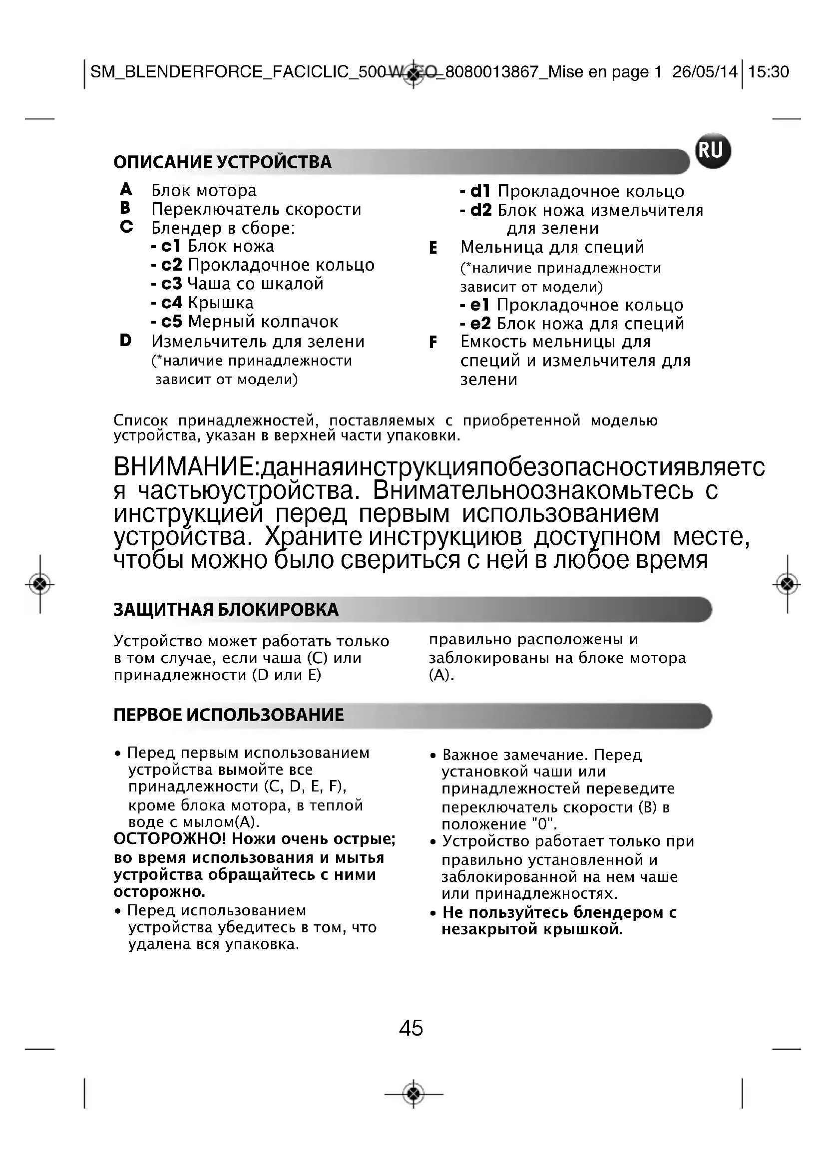 - Цвет емкости может измениться после измельчения некоторых очень твердых ингредиентов: (гвоздика, корица и т. п.). ОЧИСТКА УСТРОЙСТВА SM_BLENDERFORCE_FACICLIC_500W_EO_8080013867_Mise en page 1 26/05/14 15:3048 ЧТО ДЕЛАТЬ, ЕСЛИ УСТРОЙСТВО НЕ РАБОТАЕТ? НЕПОЛАДКИ ПРИЧИНЫ РЕШЕНИЯ Изделие не работаетОно не подключено кэлектросетиПодключите устройство кэлектрической розетке ссоответствующим напряжением.Чаша или принадлежностьрасположены неправильноили не заблокированы наблоке мотора Убедитесь в том, что чаша илипринадлежности расположенынадлежащим образом изаблокированы на блоке моторав соответствии с рисунком вданном руководстве.Сильная вибрацияИзделие расположено нанеровной поверхностиРасположите изделие наровной поверхности.Слишком большое количествоингредиентовУменьшите количествообрабатываемыхингредиентов.Крышка подтекаетСлишком большое количествоингредиентовУменьшите количествообрабатываемыхингредиентов.Крышка расположенанеправильноЗаблокируйте крышку начаше блендера надлежащимобразом.Протечка в основаниичаши блендера Прокладочное кольцо чаши(c2) расположенонеправильно или отсутствуетРасположите прокладочноекольцо надлежащим образоми заблокируйте держательножа.Протечка в основаниипринадлежностей Прокладочное кольцо блоканожа (d2) или (e2)расположено неправильноили отсутствуетРасположите прокладочноекольцо надлежащим образомна блоке ножа (d2) или (e2) изаблокируйте его на емкости (F). Нож вращается сусилиемКусочки продуктов слишкомбольшие или слишкомжесткиеУменьшите размер кусочковили количествообрабатываемыхингредиентовДобавьте жидкостьНе удаетсязаблокировать блокножа и прокладочноекольцо (c1+c2) на чаше (c3) Прокладочное кольцо (c2)расположено ненадлежащимобразомРасположите прокладочноекольцо надлежащим образомв соответствии с рис. 1. Обратитесь в авторизованный сервисный центр (см. список в буклете сервисного обслуживания). Блендер можно дополнить следующими принадлежностями, приобретаемыми у дилера или в авторизованном сервисном центре: Измельчитель для зелени (D), мельница для специй (E), дополнительная чаша блендера (C). Блендер по-прежнему не работает?