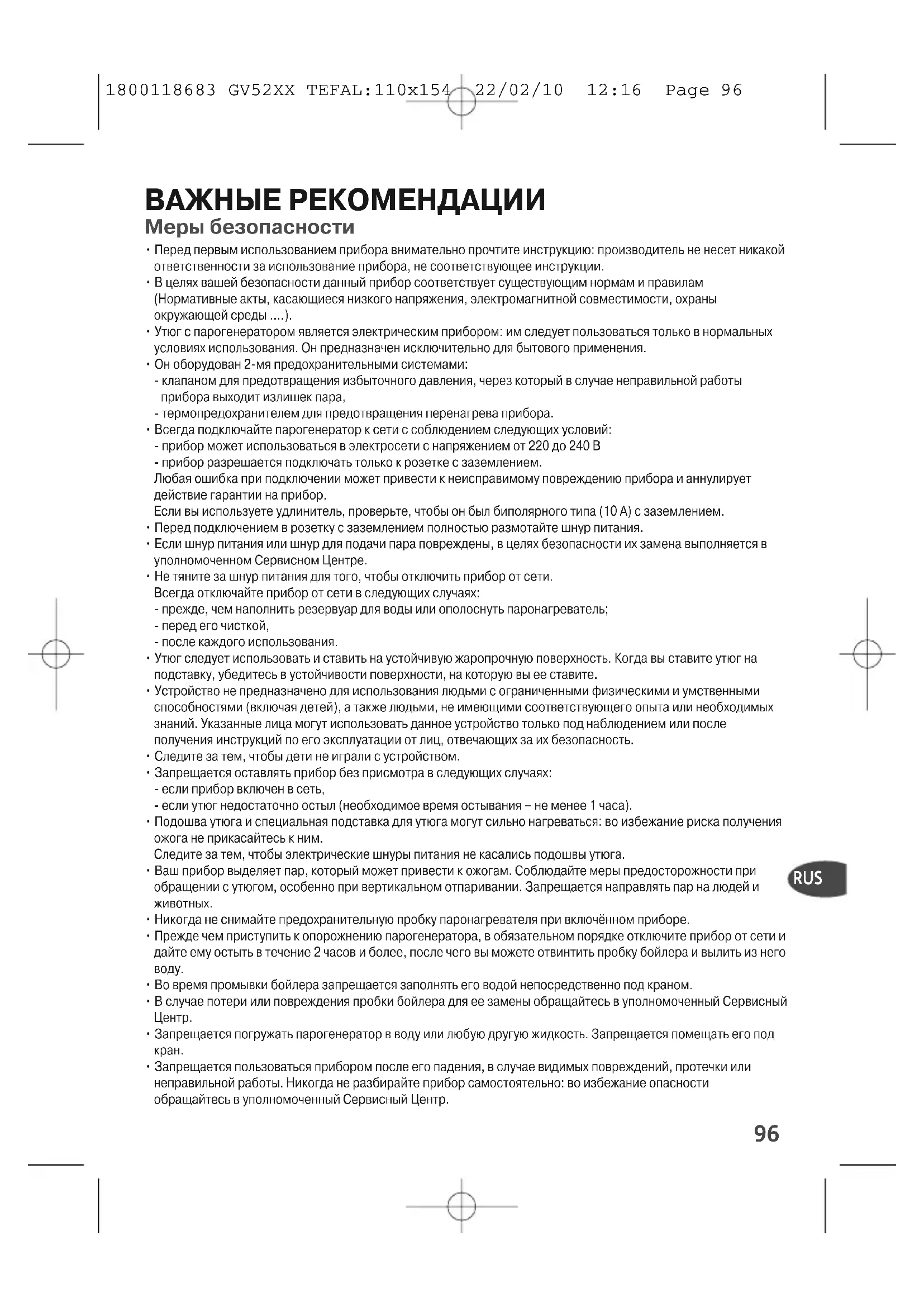 Никогда не ставьте утюг наметаллическую подставку,что может его испортить, атолько на подставку,расположенную на корпусе:она оснащенанескользящими пластинамии является жаростойкой.Если используемаяВами вода жесткая,производитесполаскивание чаще.Однако не применяйтесредства для удалениянакипи для очисткипаронагревателя: онимогут повредить его. 1800118683 GV52XX TEFAL:110x154 22/02/10 12:16 Page 99100