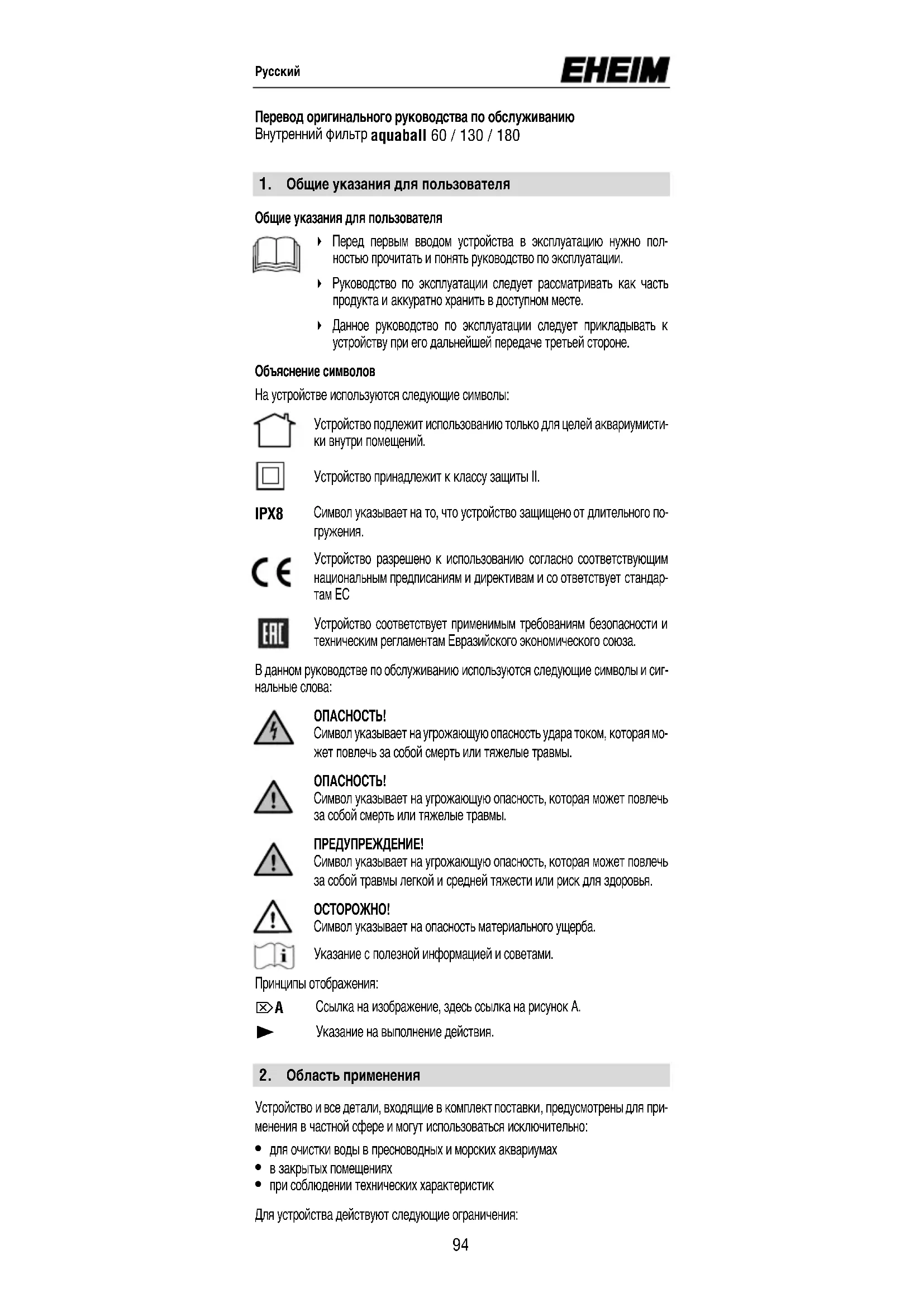 Извеждане от експлоатация и обезвреждане1. Общие указания для пользователя Общие указания для пользователя 4 Перед первым вводом устройства в эксплуатацию нужно пол- ностью прочитать и понять руководство по эксплуатации. 4 Руководство по эксплуатации следует рассматривать как часть продукта и аккуратно хранить в доступном месте. 4 Данное руководство по эксплуатации следует прикладывать к устройству при его дальнейшей передаче третьей стороне. Объяснение символов На устройстве используются следующие символы: Устройство подлежит использованию только для целей аквариумисти- ки внутри помещений. Устройство принадлежит к классу защиты II. IPX8 Символ указывает на то, что устройство защищено от длительного по-