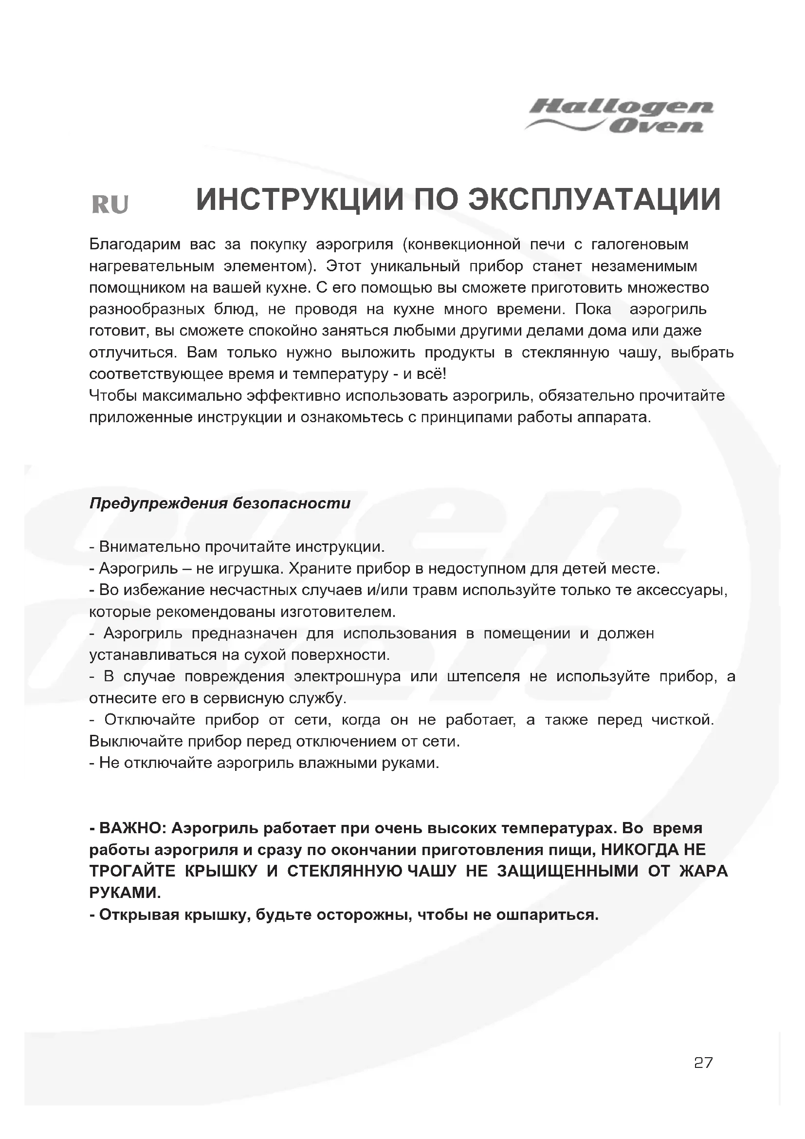 Het pictogram van een container op wielen met een kruis erdoor geeft aan dat u zich dient te informeren en de plaatselijke afvalvoorschriften voor dit soort producten dient te volgen. Gooi dit product niet met het normale huisvuil weg. U dient de desbetreffende plaatselijke voorschriften in acht te nemen. Elektrische en elektronische producten bevatten gevaarlijke stoffen die zeer schadelijk voor het milieu of de gezondheid zijn en dienen op de juiste wijze gerecycled te worden. NL27 Благодарим вас за покупку аэрогриля (конвекционной печи с галогеновым нагревательным элементом). Этот уникальный прибор станет незаменимым помощником на вашей кухне. С его помощью вы сможете приготовить множество разнообразных блюд, не проводя на кухне много времени. Пока аэрогриль готовит, вы сможете спокойно заняться любыми другими делами дома или даже отлучиться. Вам только нужно выложить продукты в стеклянную чашу, выбрать соответствующее время и температуру - и всё! Чтобы максимально эффективно использовать аэрогриль, обязательно прочитайте приложенные инструкции и ознакомьтесь с принципами работы аппарата. Предупреждения безопасности - Внимательно прочитайте инструкции. - Аэрогриль – не игрушка. Храните прибор в недоступном для детей месте. - Во избежание несчастных случаев и/или травм используйте только те аксессуары, которые рекомендованы изготовителем. - Аэрогриль предназначен для использования в помещении и должен устанавливаться на сухой поверхности. - В случае повреждения электрошнура или штепселя не используйте прибор, а отнесите его в сервисную службу. - Отключайте прибор от сети, когда он не работает, а также перед чисткой. Выключайте прибор перед отключением от сети. - Не отключайте аэрогриль влажными руками. - ВАЖНО: Аэрогриль работает при очень высоких температурах. Во время работы аэрогриля и сразу по окончании приготовления пищи, НИКОГДА НЕ ТРОГАЙТЕ КРЫШКУ И СТЕКЛЯННУЮ ЧАШУ НЕ ЗАЩИЩЕННЫМИ ОТ ЖАРА