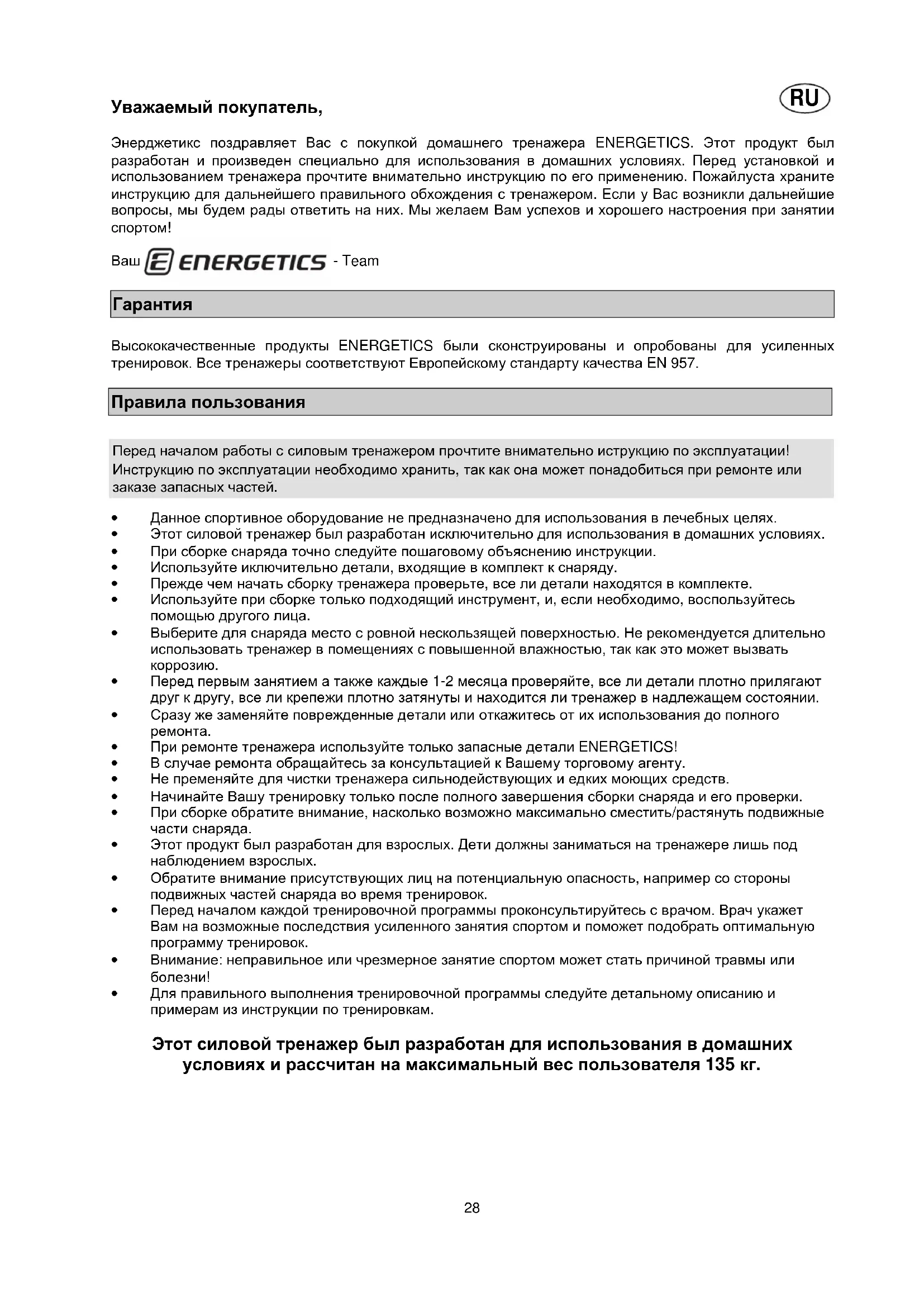 Уважаемый покупатель, Энерджетикс поздравляет Вас с покупкой домашнего тренажера ENERGETICS. Этот продукт был разработан и произведен специально для использования в домашних условиях. Перед установкой и использованием тренажера прочтите внимательно инструкцию по его применению. Пожайлуста храните инструкцию для дальнейшего правильного обхождения с тренажером. Если у Вас возникли дальнейшие вопросы, мы будем рады ответить на них. Мы желаем Вам успехов и хорошего настроения при занятии