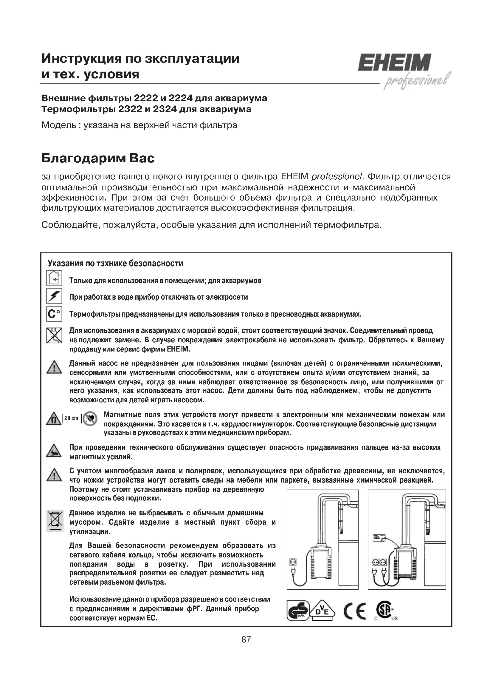 °87 Инструкция по зксплуатации и тех. условия Внешние фильтры 2222 и 2224 для аквариума Термофильтры 2322 и 2324 для аквариума Модель : указана на верхней части фильтра Благодарим Вас за приобретение вашего нового внутреннего фильтра EHEIM professionel. Фильтр отличается оптимальной производительностью при максимальной надежности и максимальной зффекивности. При этом за счет большого объема фильтра и специально подобранных фильтрующих материалов достигается высокоэффективная фильтрация. Соблюдайте, пожалуйста, особые указания для исполнений термофильтра. Указания по тзхнике безопасности Только для использования в помещении; для аквариумовПри работах в воде прибор отключать от электросетиТермофильтры предназначены для использования только в пресноводных аквариумах. Для использования в аквариумах с морской водой, стоит соответствующий значок. Соединительный проводне подлежит замене. В случае повреждения электрокабеля не использовать фильтр. Обратитесь к Вашемупродавцу или сервис фирмы EHEIM.Данный насос не предназначен для пользования лицами (включая детей) с ограниченными психическими,сенсорными или умственными способностями, или с отсутствием опыта и/или отсутствием знаний, заисключением случая, когда за ними наблюдает ответственное за безопасность лицо, или получившими от него указания, как использовать этот насос. Дети должны быть под наблюдением, чтобы не допуститьвозможности для детей играть насосом. Магнитные поля этих устройств могут привести к электронным или механическим помехам или повреждениям. Это касается в т.ч. кардиостимуляторов. Соответствующие безопасные дистанцииуказаны в руководствах к этим медицинским приборам. При проведении технического обслуживания существует опасность придавливания пальцев из-за высокихмагнитных усилий. С учетом многообразия лаков и полировок, использующихся при обработке древесины, не исключается, что ножки устройства могут оставить следы на мебели или паркете, вызваанные химической реакцией.Поэтому не стоит устанавливать прибор на деревяннуюповерхность без подложки.Данное изделие не выбрасывать с обычным домашним мусором. Сдайте изделие в местный пункт сбора и утилизации. Для Вашей безопасности рекомендуем образовать из сетевого кабеля кольцо, чтобы исключить возможность попадания воды в розетку. При использовании распределительной розетки ее следует разместить надсетевым разъемом фильтра.Использование данного прибора разрешено в соответствиис предписаниями и директивами фРГ. Данный приборсоответствует нормам ЕС.