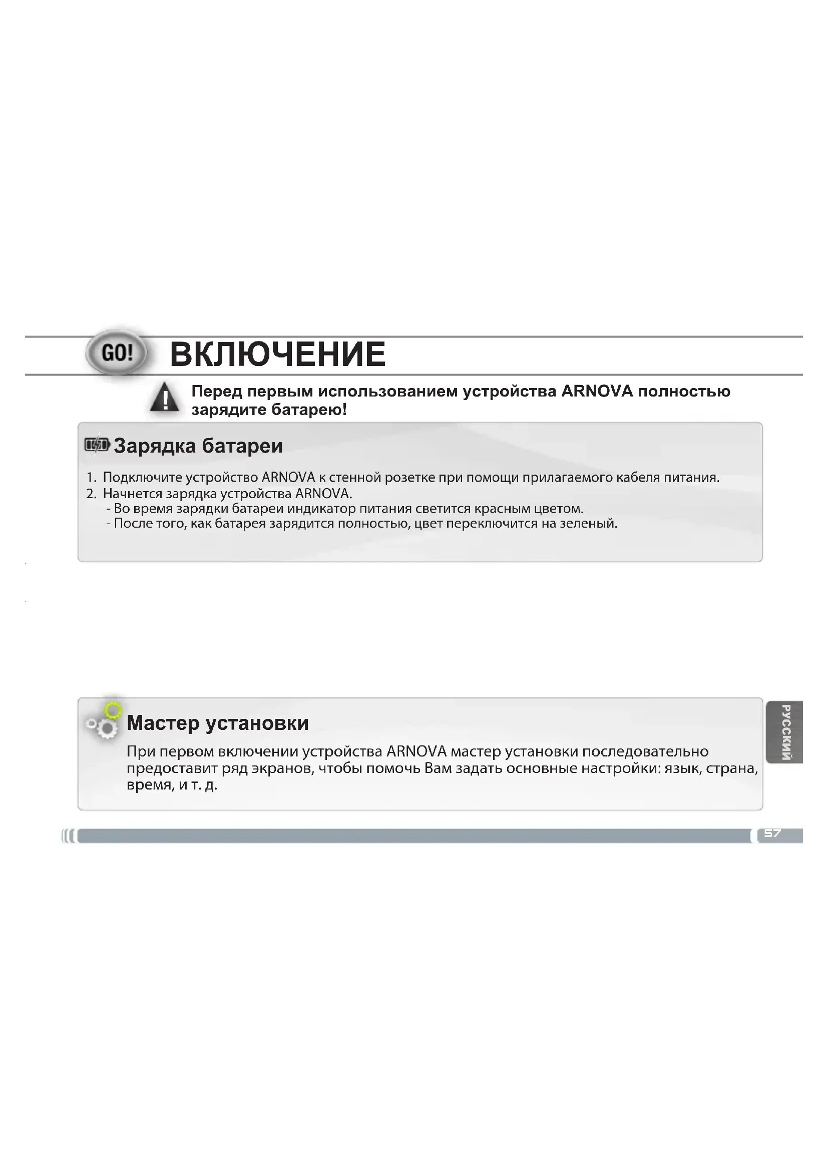 Мастер установки При первом включении устройства ARNOVA мастер установки последовательно предоставит ряд экранов, чтобы помочь Вам задать основные настройки: язык, страна, время, и т. д. Перед первым использованием устройства ARNOVA полностью зарядите батарею! 1. Подключите устройство ARNOVA к стенной розетке при помощи прилагаемого кабеля питания. 2. Начнется зарядка устройства ARNOVA. - Во время зарядки батареи индикатор питания светится красным цветом. - После того, как батарея зарядится полностью, цвет переключится на зеленый. Зарядка батареи58