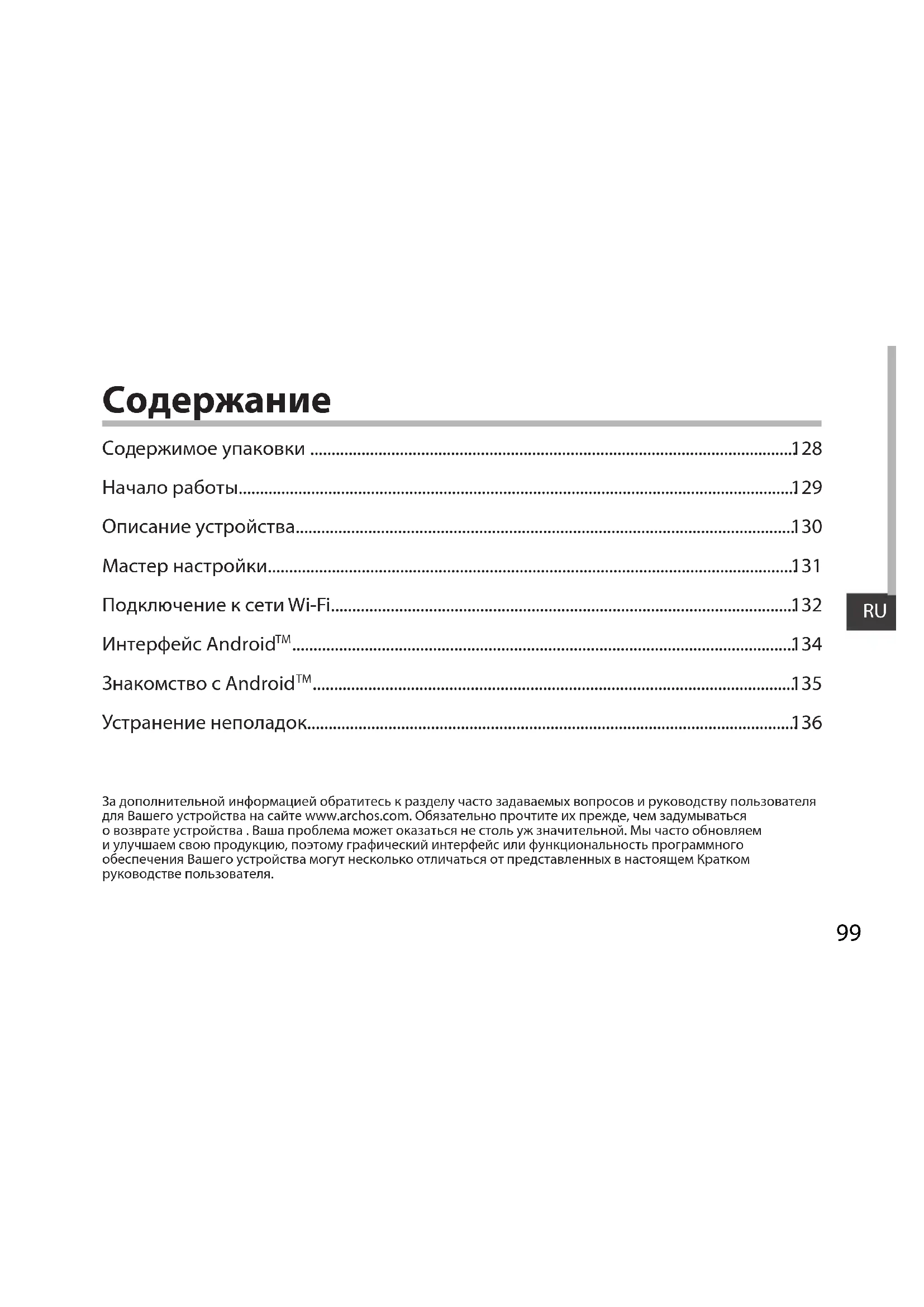 За дополнительной информацией обратитесь к разделу часто задаваемых вопросов и руководству пользователя для Вашего устройства на сайте www.archos.com. Обязательно прочтите их прежде, чем задумываться о возврате устройства . Ваша проблема может оказаться не столь уж значительной. Мы часто обновляем и улучшаем свою продукцию, поэтому графический интерфейс или функциональность программного обеспечения Вашего устройства могут несколько отличаться от представленных в настоящем Кратком руководстве пользователя. Содержимое упаковки .................................................................................................................. Начало работы................................................................................................................................... Описание устройства..................................................................................................................... Мастер настройки............................................................................................................................ Подключение к сети Wi-Fi............................................................................................................. Интерфейс Android