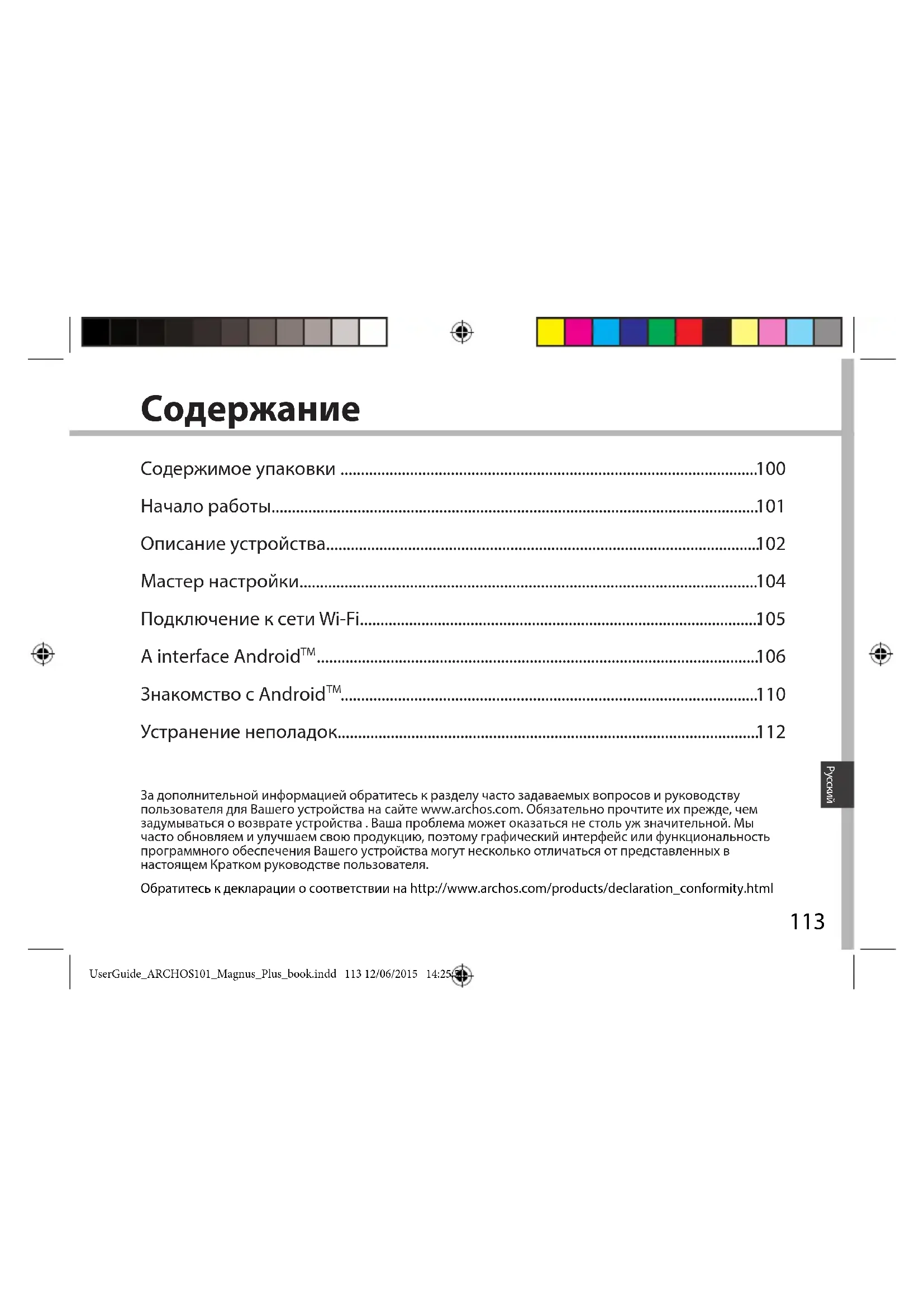 За дополнительной информацией обратитесь к разделу часто задаваемых вопросов и руководству пользователя для Вашего устройства на сайте www.archos.com. Обязательно прочтите их прежде, чем задумываться о возврате устройства . Ваша проблема может оказаться не столь уж значительной. Мы часто обновляем и улучшаем свою продукцию, поэтому графический интерфейс или функциональность программного обеспечения Вашего устройства могут несколько отличаться от представленных в настоящем Кратком руководстве пользователя. Содержимое упаковки ...................................................................................................... Начало работы....................................................................................................................... Описание устройства.......................................................................................................... Мастер настройки................................................................................................................ Подключение к сети Wi-Fi.................................................................................................. A interface Android