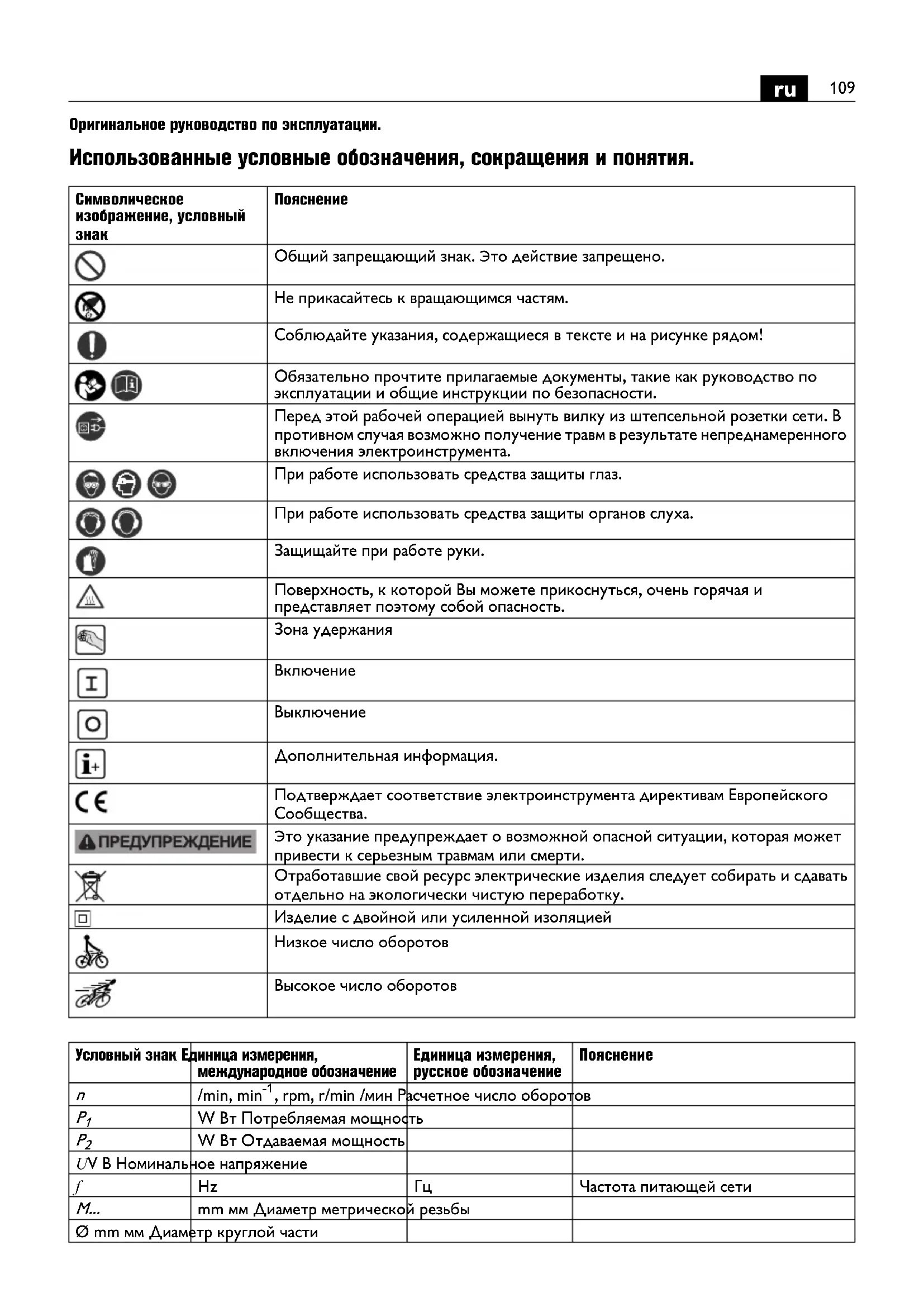 Дополнительная информация. Подтверждает соответствие электроинструмента директивам Европейского Сообщества. Это указание предупреждает о возможной опасной ситуации, которая может привести к серьезным травмам или смерти. Отработавшие свой ресурс электрические изделия следует собирать и сдавать отдельно на экологически чистую переработку. Изделие с двойной или усиленной изоляцией Низкое число оборотов Высокое число оборотов Условный знак Eдиница измерения, международное обозначение Eдиница измерения, русское обозначение