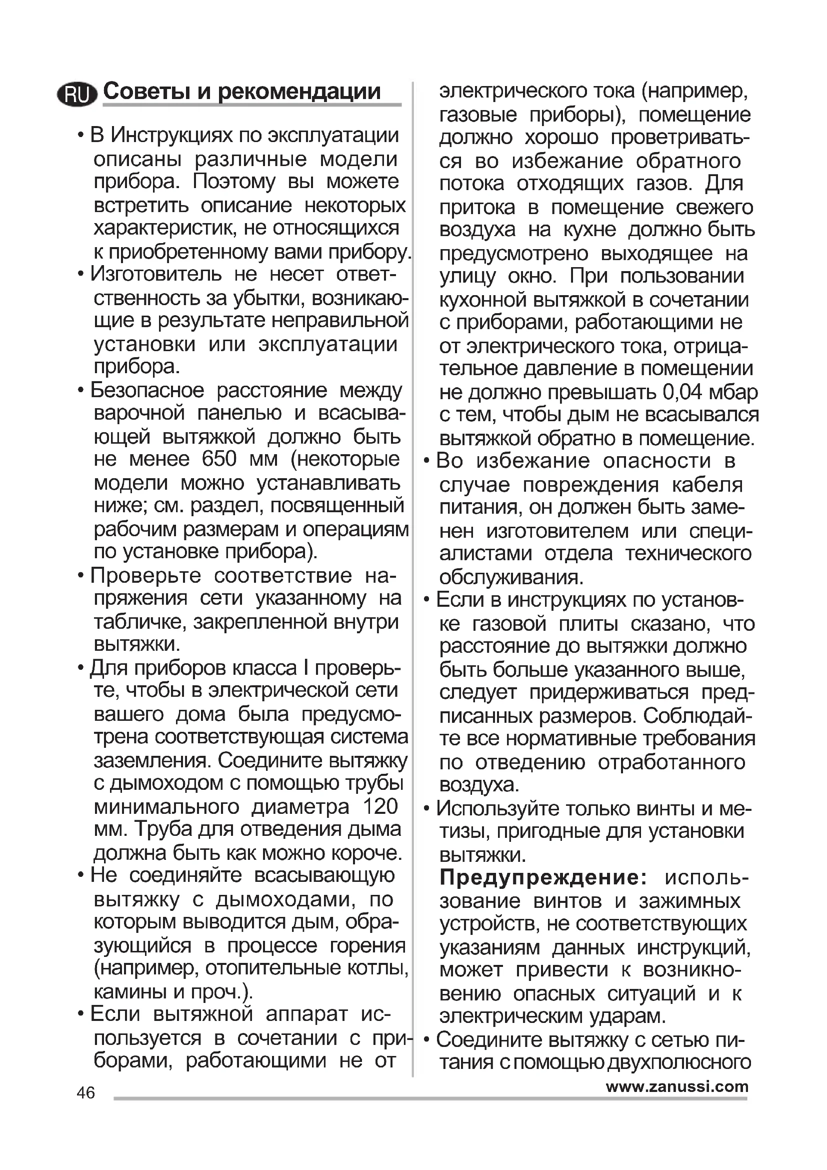 - Соедините вытяжку с сетью пи- тания с помощью двухполюсного RU47 www.zanussi.com выключателя с минимальным разведением контактов 3 мм. Эксплуатация
