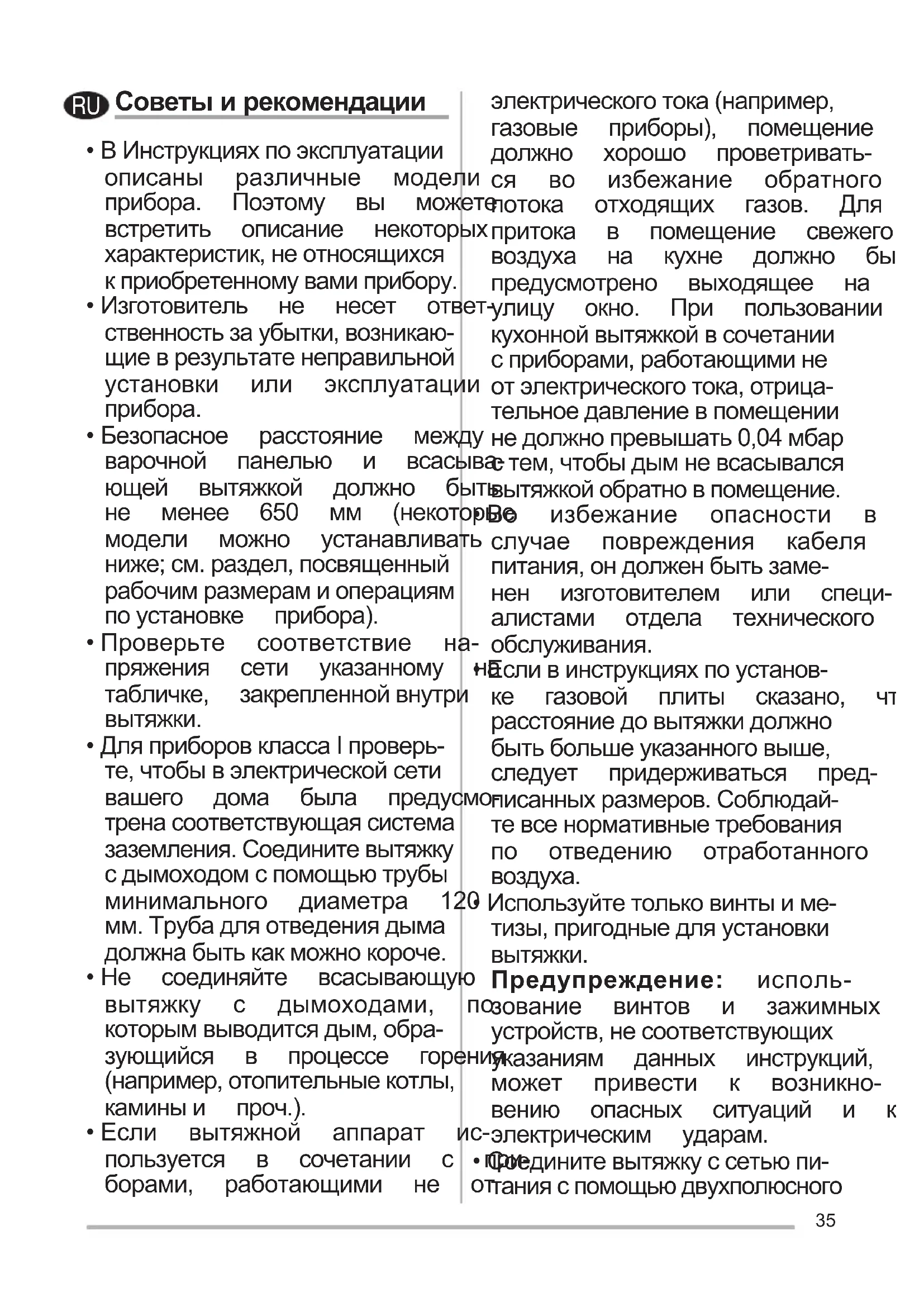 - Не соединяйте всасывающую вытяжку с дымоходами, по которымвыводитсядым,обра- зующийся в процессе горения (например,отопительныекотлы, каминыи проч.).