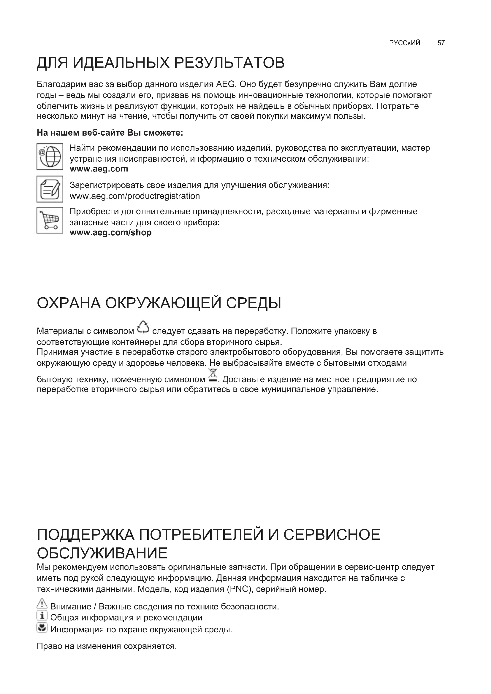 Afbryd apparatet fra el-nettet. Pas på! Sørg for at pærerne er kolde før de berøres. Benyt kun halogenpærer på 12V -20W max - G4, og sørg for ikke at røre ved dem med hænderne.57 PYCCĸИЙ ДЛЯ ИДЕАЛЬНЫХ РЕЗУЛЬТАТОВ Благодарим вас за выбор данного изделия AEG. Оно будет безупречно служить Вам долгие годы – ведь мы создали его, призвав на помощь инновационные технологии, которые помогают облегчить жизнь и реализуют функции, которых не найдешь в обычных приборах. Потратьте несколько минут на чтение, чтобы получить от своей покупки максимум пользы. На нашем веб-сайте Вы сможете: Найти рекомендации по использованию изделий, руководства по эксплуатации, мастер устранения неисправностей, информацию о техническом обслуживании: www.aeg.com Зарегистрировать свое изделия для улучшения обслуживания: www.aeg.com/productregistration Приобрести дополнительные принадлежности, расходные материалы и фирменные запасные части для своего прибора: www.aeg.com/shop ОХРАНА ОКРУЖАЮЩЕЙ СРЕДЫ Материалы с символом следует сдавать на переработку. Положите упаковку в соответствующие контейнеры для сбора вторичного сырья. Принимая участие в переработке старого электробытового оборудования, Вы помогаете защитить окружающую среду и здоровье человека. Не выбрасывайте вместе с бытовыми отходами бытовую технику, помеченную символом . Доставьте изделие на местное предприятие по переработке вторичного сырья или обратитесь в свое муниципальное управление. ПОДДЕРЖКА ПОТРЕБИТЕЛЕЙ И СЕРВИСНОЕ ОБСЛУЖИВАНИЕ Мы рекомендуем использовать оригинальные запчасти. При обращении в сервис-центр следует иметь под рукой следующую информацию. Данная информация находится на табличке с техническими данными. Модель, код изделия (PNC), серийный номер. Внимание / Важные сведения по технике безопасности. Общая информация и рекомендации Информация по охране окружающей среды. Право на изменения сохраняется.