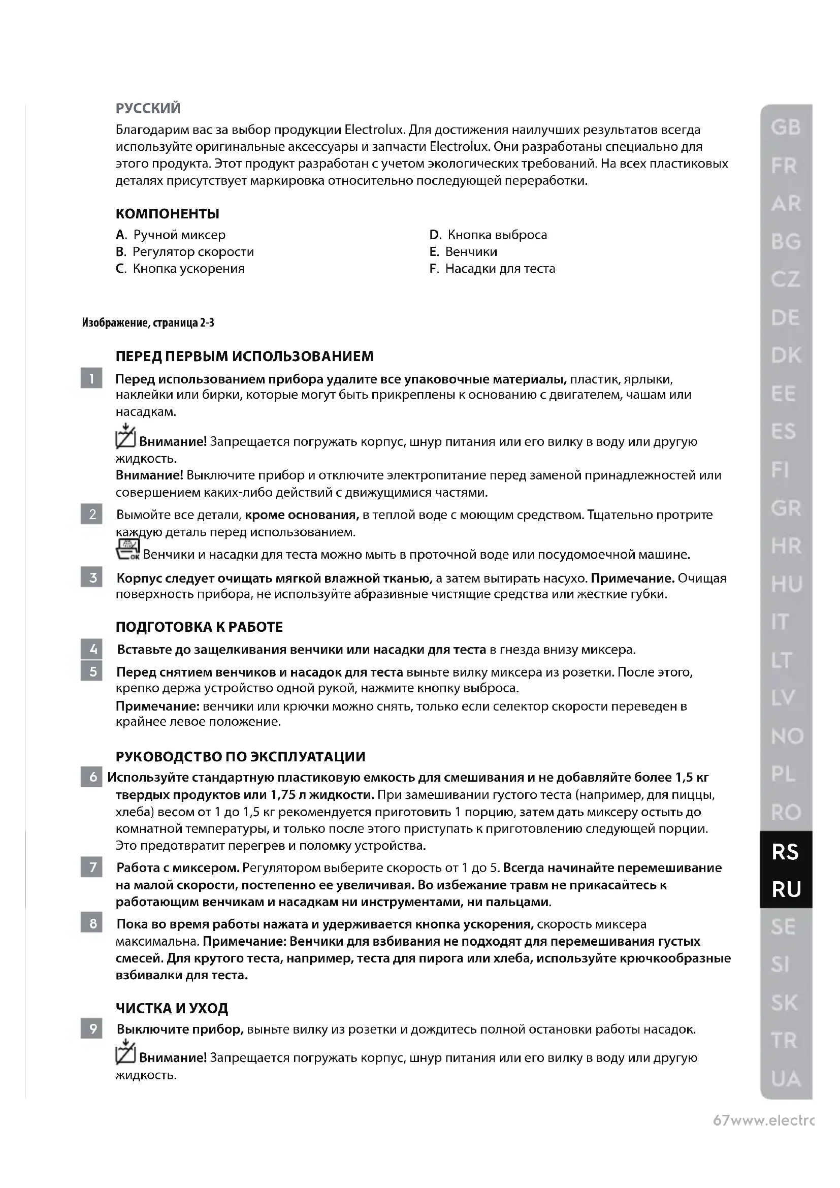 RS68www.electrolux.com 10 Вымойте все детали, кроме основания, в теплой воде с моющим средством. Тщательно протрите каждую деталь перед использованием. Венчики и насадки для теста можно мыть в проточной воде или посудомоечной машине. 11 Корпус следует очищать мягкой влажной тканью, а затем вытирать насухо. Примечание. Очищая поверхность прибора, не используйте абразивные чистящие средства или жесткие губки. Прежде чем положить прибор на хранение, выньте вилку из розетки. Убедитесь, что прибор чистый и совершенно сухой. Наслаждайтесь новым продуктом Electrolux! МЕРЫ ПРЕДОСТОРОЖНОСТИ Перед первым применением устройства внимательно прочтите следующую инструкцию.