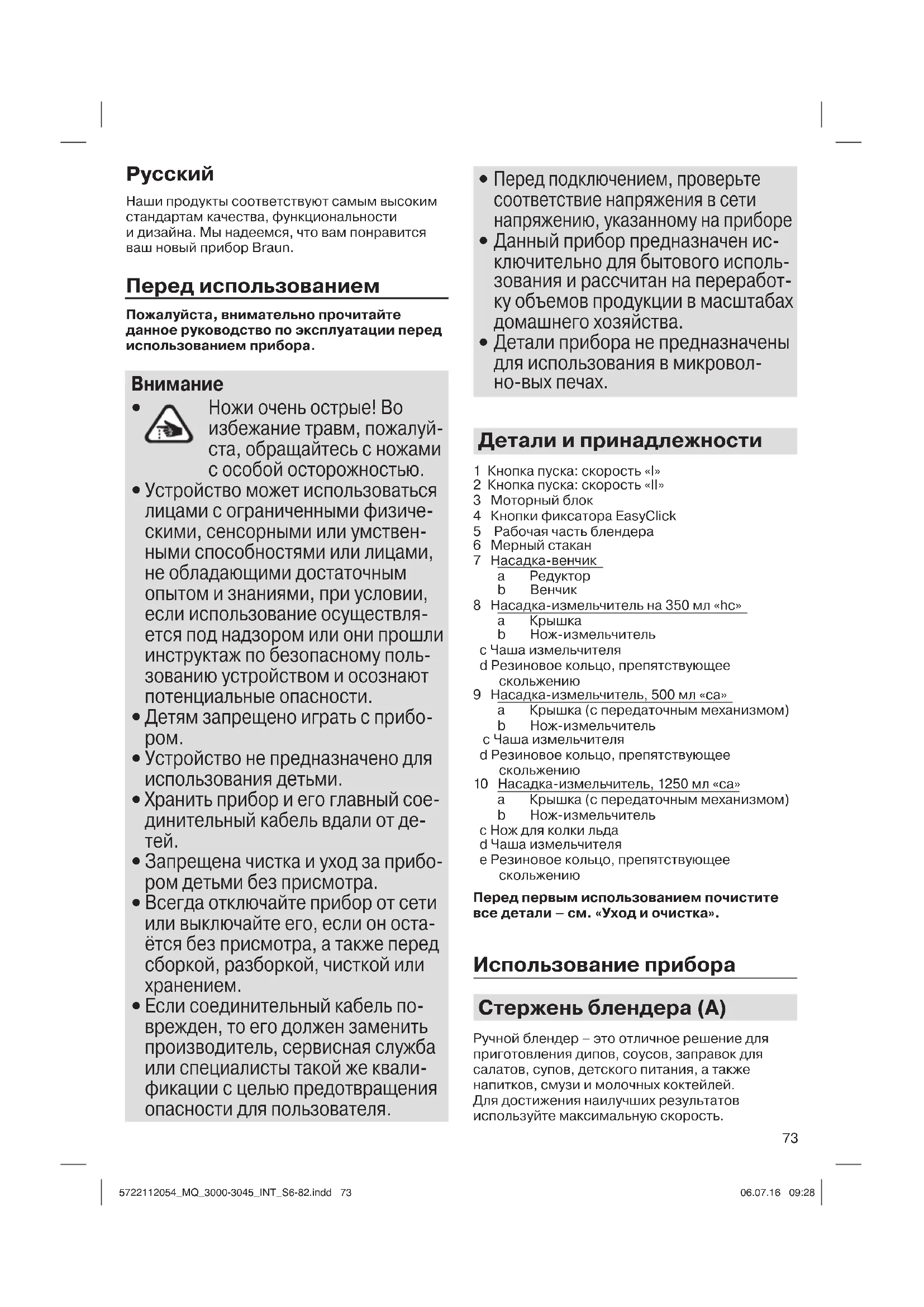 Перед первым использованием почистите все детали – см. «Уход и очистка». Использование прибора Стержень блендера (А) Ручной блендер – это отличное решение для приготовления дипов, соусов, заправок для салатов, супов, детского питания, а также напитков, смузи и молочных коктейлей. Для достижения наилучших результатов используйте максимальную скорость. 5722112054_MQ_3000-3045_INT_S6-82.indd 735722112054_MQ_3000-3045_INT_S6-82.indd 73 06.07.16 09:2806.07.16 09:2874 Сборка и эксплуатация
