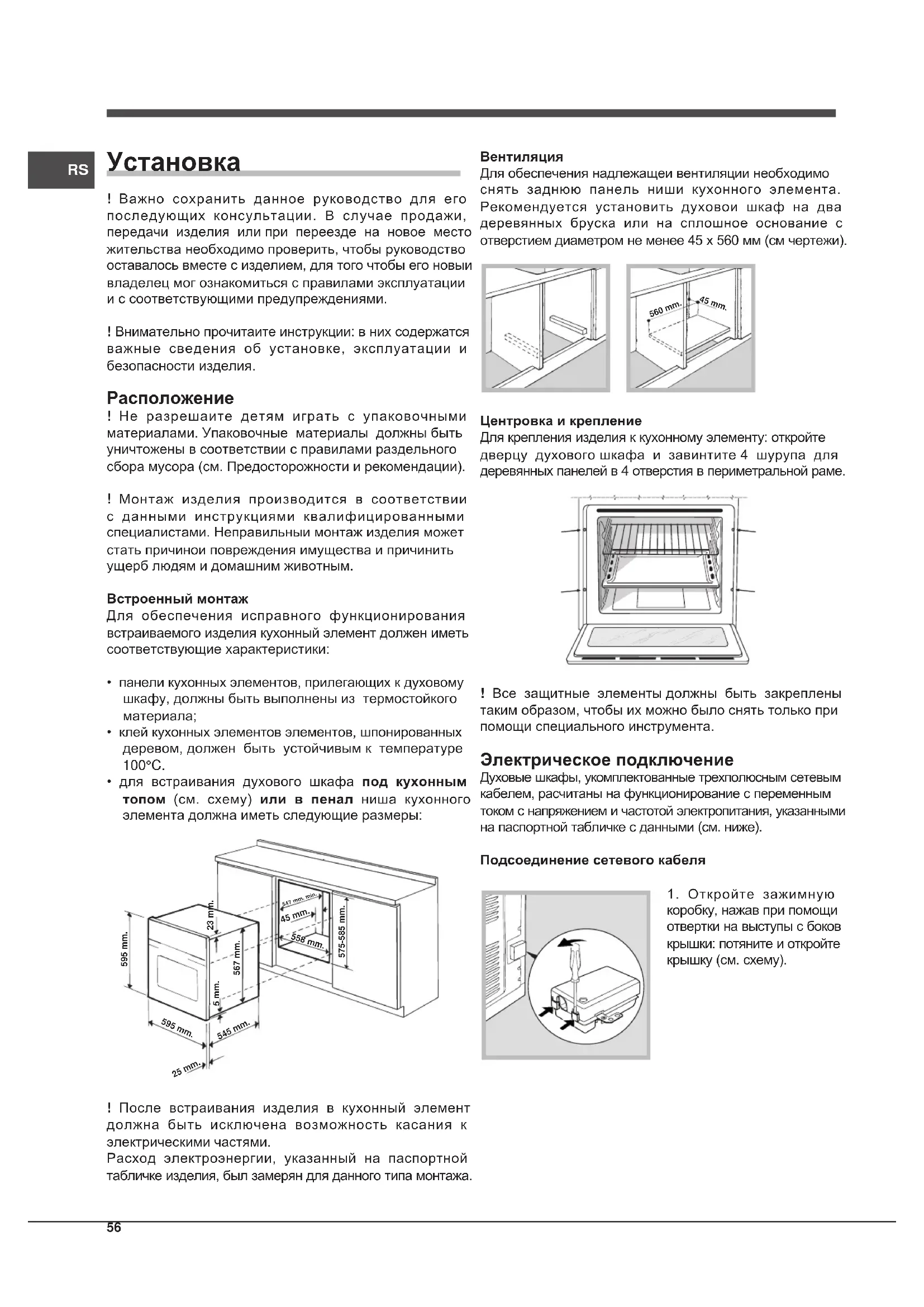 ! Важно сохранить данное руководство для его последующих консультации. В случае продажи, передачи изделия или при переезде на новое место жительства необходимо проверить, чтобы руководство оставалось вместе с изделием, для того чтобы его новыи владелец мог ознакомиться с правилами эксплуатации и с соответствующими предупреждениями. ! Внимательно прочитаите инструкции: в них содержатся важные сведения об установке, эксплуатации и безопасности изделия. Расположение ! Не разрешаите детям играть с упаковочными материалами. Упаковочные материалы должны быть уничтожены в соответствии с правилами раздельного сбора мусора (см. Предосторожности и рекомендации). ! Монтаж изделия производится в соответствии с данными инструкциями квалифицированными специалистами. Неправильныи монтаж изделия может стать причинои повреждения имущества и причинить ущерб людям и домашним животным. Встроенный монтаж Для обеспечения исправного функционирования встраиваемого изделия кухонный элемент должен иметь соответствующие характеристики: