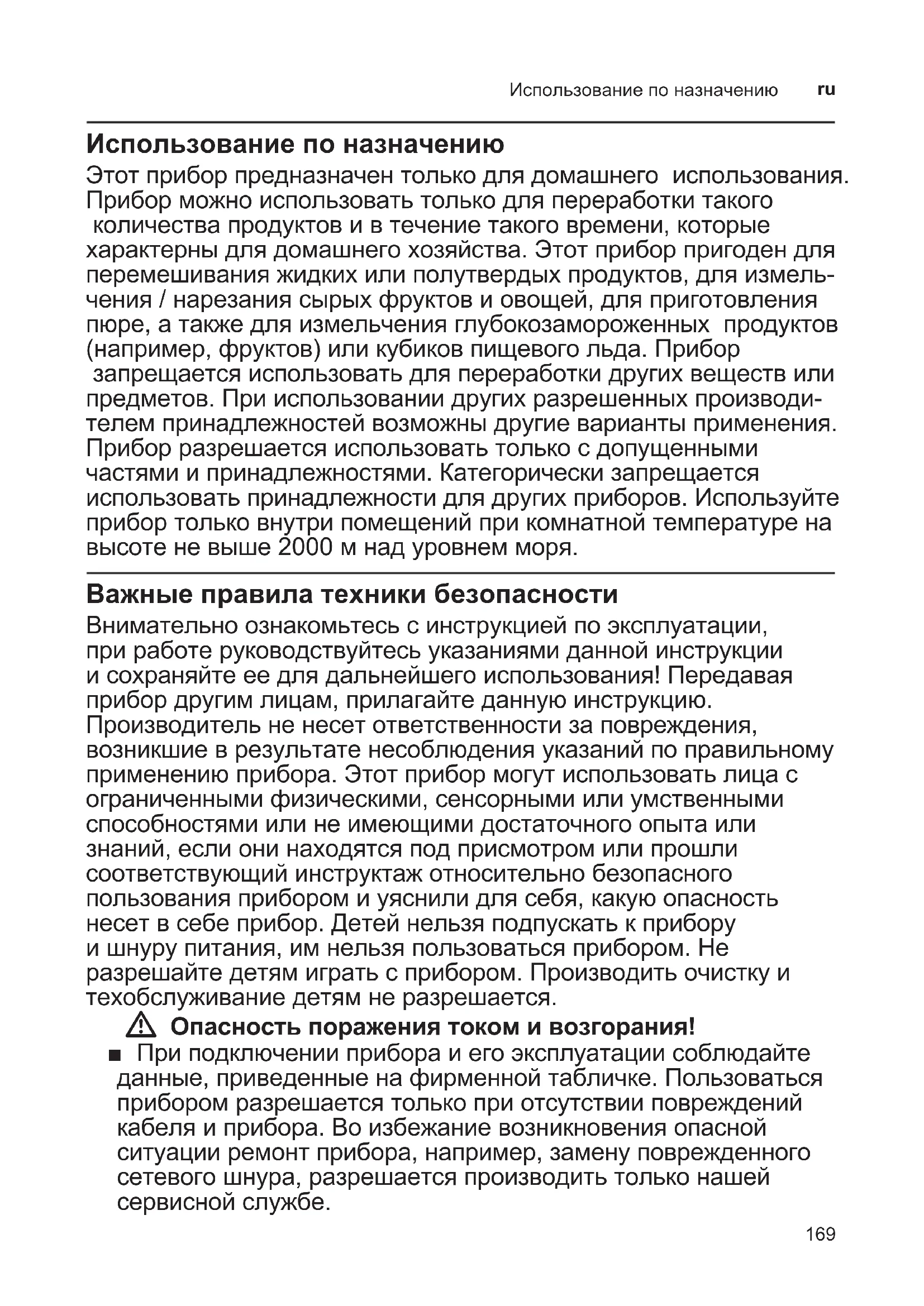 Использование по назначению Этот прибор предназначен только для домашнего использования. Прибор можно использовать только для переработки такого количества продуктов и в течение такого времени, которые характерны для домашнего хозяйства. Этот прибор пригоден для перемешивания жидких или полутвердых продуктов, для измель- чения / нарезания сырых фруктов и овощей, для приготовления пюре, а также для измельчения глубокозамороженных продуктов (например, фруктов) или кубиков пищевого льда. Прибор запрещается использовать для переработки других веществ или предметов. При использовании других разрешенных производи- телем принадлежностей возможны другие варианты применения. Прибор разрешается использовать только с допущенными частями и принадлежностями. Категорически запрещается использовать принадлежности для других приборов. Используйте прибор только внутри помещений при комнатной температуре на высоте не выше 2000 м над уровнем моря. Важные правила техники безопасности Внимательно ознакомьтесь с инструкцией по эксплуатации, при работе руководствуйтесь указаниями данной инструкции и сохраняйте ее для дальнейшего использования! Передавая прибор другим лицам, прилагайте данную инструкцию. Производитель не несет ответственности за повреждения, возникшие в результате несоблюдения указаний по правильному применению прибора. Этот прибор могут использовать лица с ограниченными физическими, сенсорными или умственными способностями или не имеющими достаточного опыта или знаний, если они находятся под присмотром или прошли соответствующий инструктаж относительно безопасного пользования прибором и уяснили для себя, какую опасность несет в себе прибор. Детей нельзя подпускать к прибору и шнуру питания, им нельзя пользоваться прибором. Не разрешайте детям играть с прибором. Производить очистку и техобслуживание детям не разрешается. W Опасность поражения током и возгорания! ■ При подключении прибора и его эксплуатации соблюдайте данные, приведенные на фирменной табличке. Пользоваться прибором разрешается только при отсутствии повреждений кабеля и прибора. Во избежание возникновения опасной ситуации ремонт прибора, например, замену поврежденного сетевого шнура, разрешается производить только нашей сервисной службе.170 Важные правила техники безопасности