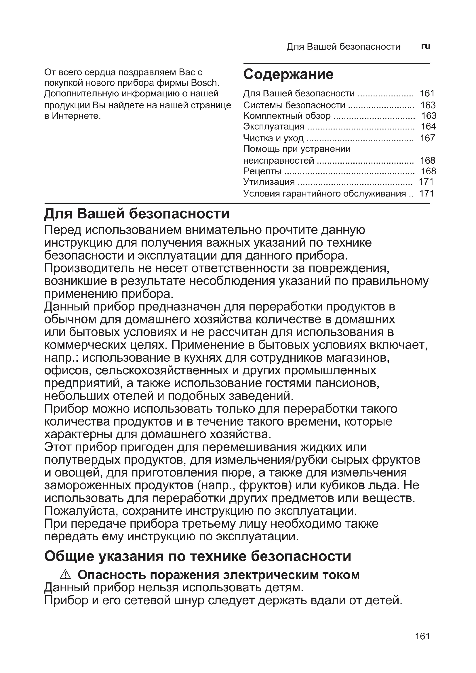 Для Вашей безопасности Передиспользованиемвнимательнопрочтитеданную инструкциюдляполученияважныхуказанийпотехнике безопасностииэксплуатациидляданногоприбора. Производительненесетответственностизаповреждения, возникшиеврезультатенесоблюденияуказанийпоправильному применениюприбора. Данныйприборпредназначендляпереработкипродуктовв обычномдлядомашнегохозяйстваколичествевдомашних илибытовыхусловияхинерассчитандляиспользованияв коммерческихцелях.Применениевбытовыхусловияхвключает, напр.:использованиевкухняхдлясотрудниковмагазинов, офисов,сельскохозяйственныхидругихпромышленных предприятий,атакжеиспользованиегостямипансионов, небольшихотелейиподобныхзаведений. Приборможноиспользоватьтолькодляпереработкитакого количествапродуктовивтечениетакоговремени,которые характерныдлядомашнегохозяйства. Этотприборпригодендляперемешиванияжидкихили полутвердыхпродуктов,дляизмельчения/рубкисырыхфруктов иовощей,дляприготовленияпюре,атакжедляизмельчения замороженныхпродуктов(напр.,фруктов)иликубиковльда.Hе использоватьдляпереработкидругихпредметовиливеществ. Пожалуйста,сохранитеинструкциюпоэксплуатации. Припередачеприборатретьемулицунеобходимотакже передатьемуинструкциюпоэксплуатации. Общие указания по технике безопасности A Опасность поражения электрическим током Данныйприборнельзяиспользоватьдетям. Прибориегосетевойшнурследуетдержатьвдалиотдетей. ОтвсегосердцапоздравляемВасс покупкойновогоприборафирмыBosch. Дополнительнуюинформациюонашей продукцииВынайдетенанашейстранице вИнтернете.