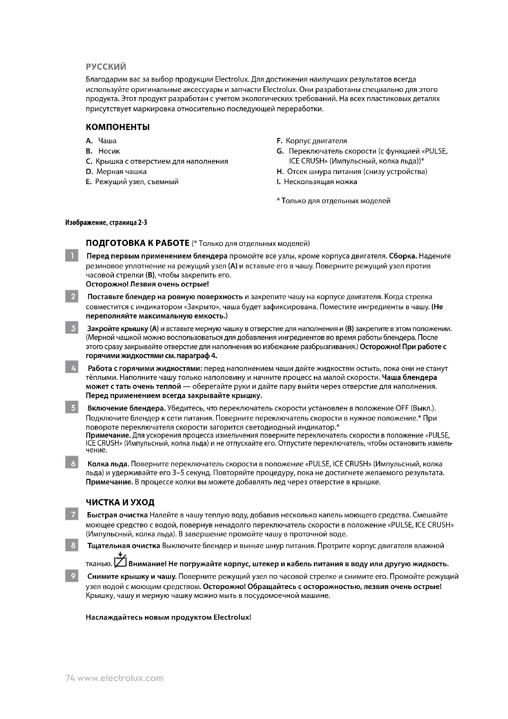 Благодарим вас за выбор продукции Electrolux. Для достижения наилучших результатов всегда используйте оригинальные аксессуары и запчасти Electrolux. Они разработаны специально для этого продукта. Этот продукт разработан с учетом экологических требований. На всех пластиковых деталях присутствует маркировка относительно последующей переработки.