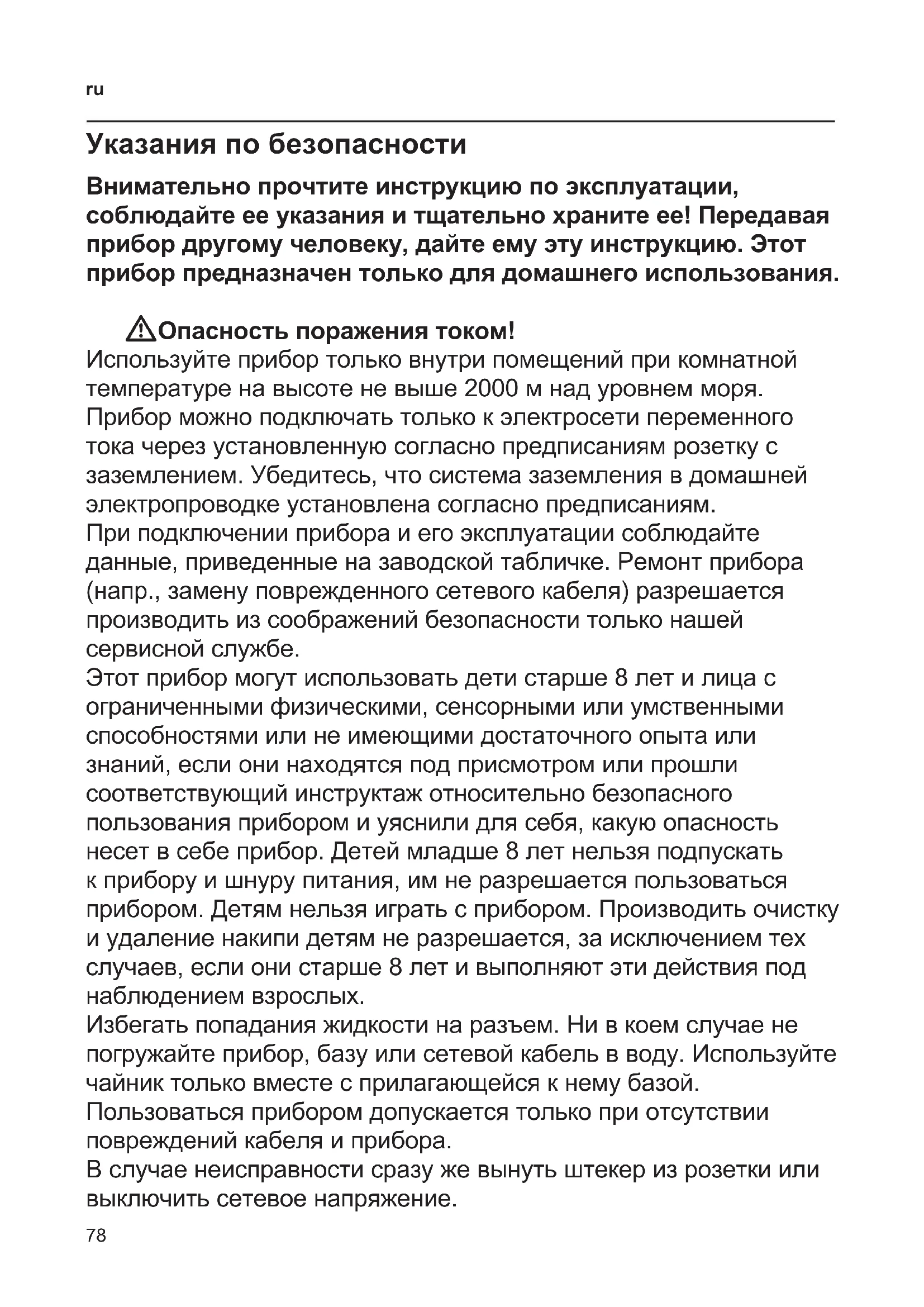 Указания по безопасности Внимательно прочтите инструкцию по эксплуатации, соблюдайте ее указания и тщательно храните ее! Передавая прибор другому человеку, дайте ему эту инструкцию. Этот прибор предназначен только для домашнего использования. WОпасность поражения током! Используйте прибор только внутри помещений при комнатной температуре на высоте не выше 2000 м над уровнем моря. Прибор можно подключать только к электросети переменного тока через установленную согласно предписаниям розетку с заземлением. Убедитесь, что система заземления в домашней электропроводке установлена согласно предписаниям. При подключении прибора и его эксплуатации соблюдайте данные, приведенные на заводской табличке. Ремонт прибора (напр., замену поврежденного сетевого кабеля) разрешается производить из соображений безопасности только нашей сервисной службе. Этот прибор могут использовать дети старше 8 лет и лица с ограниченными физическими, сенсорными или умственными способностями или не имеющими достаточного опыта или знаний, если они находятся под присмотром или прошли соответствующий инструктаж относительно безопасного пользования прибором и уяснили для себя, какую опасность несет в себе прибор. Детей младше 8 лет нельзя подпускать к прибору и шнуру питания, им не разрешается пользоваться прибором. Детям нельзя играть с прибором. Производить очистку и удаление накипи детям не разрешается, за исключением тех случаев, если они старше 8 лет и выполняют эти действия под наблюдением взрослых. Избегать попадания жидкости на разъем. Ни в коем случае не погружайте прибор, базу или сетевой кабель в воду. Используйте чайник только вместе с прилагающейся к нему базой. Пользоваться прибором допускается только при отсутствии повреждений кабеля и прибора. В случае неисправности сразу же вынуть штекер из розетки или выключить сетевое напряжение.79