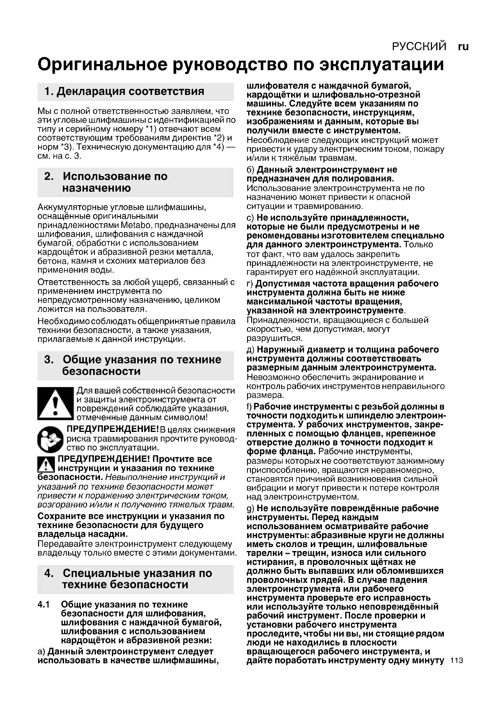 Оригинальное руководство по эксплуатации Мы с полной ответственностью заявляем, что эти угловые шлифмашины с идентификацией по типу и серийному номеру *1) отвечают всем соответствующим требованиям директив *2) и норм *3). Техническую документацию для *4) — см. на с. 3. Аккумуляторные угловые шлифмашины, оснащённые оригинальными принадлежностями Metabo, предназначены для шлифования, шлифования с наждачной бумагой, обработки с использованием кардощёток и абразивной резки металла,