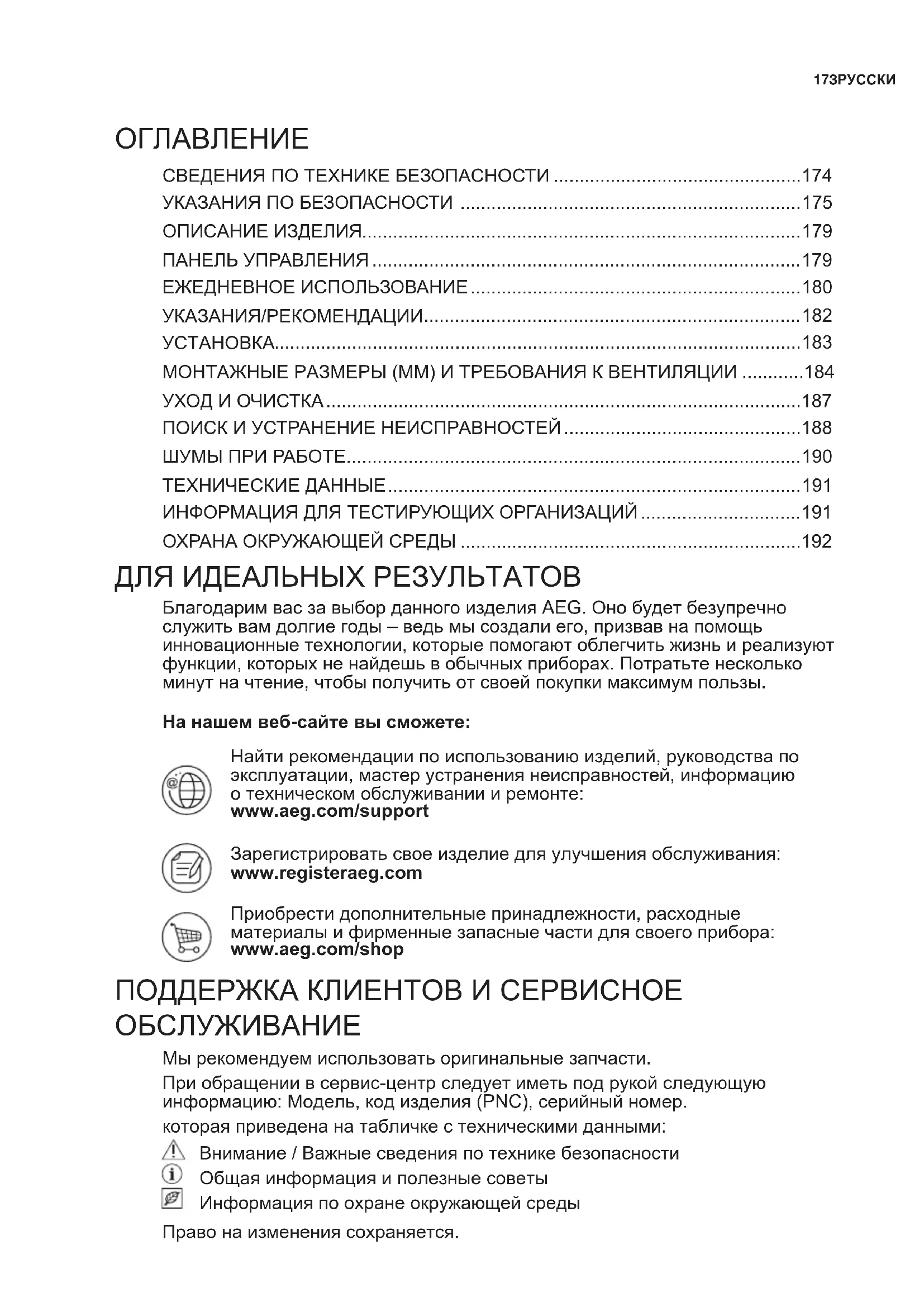 - БлагодаримвасзавыборданногоизделияAEG.Онобудетбезупречно служитьвамдолгиегоды–ведьмысоздалиего,призвавнапомощь инновационныетехнологии,которыепомогаютоблегчитьжизньиреализуют функции,которыхненайдешьвобычныхприборах.Потратьтенесколько минутначтение,чтобыполучитьотсвоейпокупкимаксимумпользы. На нашем веб-сайте вы сможете: Найтирекомендациипоиспользованиюизделий,руководствапо эксплуатации,мастерустранениянеисправностей,информацию отехническомобслуживаниииремонте: www.aeg.com/support Зарегистрироватьсвоеизделиедляулучшенияобслуживания: www.registeraeg.com Приобрестидополнительныепринадлежности,расходные материалыифирменныезапасныечастидлясвоегоприбора: www.aeg.com/shop ДЛЯИДЕАЛЬНЫХРЕЗУЛЬТАТОВ ПОДДЕРЖКАКЛИЕНТОВИСЕРВИСНОЕ ОБСЛУЖИВАНИЕ Мырекомендуемиспользоватьоригинальныезапчасти. Приобращениивсервис-центрследуетиметьподрукойследующую информацию:Модель,кодизделия(PNC),серийныйномер. котораяприведенанатабличкестехническимиданными: Внимание/Важныесведенияпотехникебезопасности Общаяинформацияиполезныесоветы Информацияпоохранеокружающейсреды Правонаизменениясохраняется. СВЕДЕНИЯПОТЕХНИКЕБЕЗОПАСНОСТИ p. 174