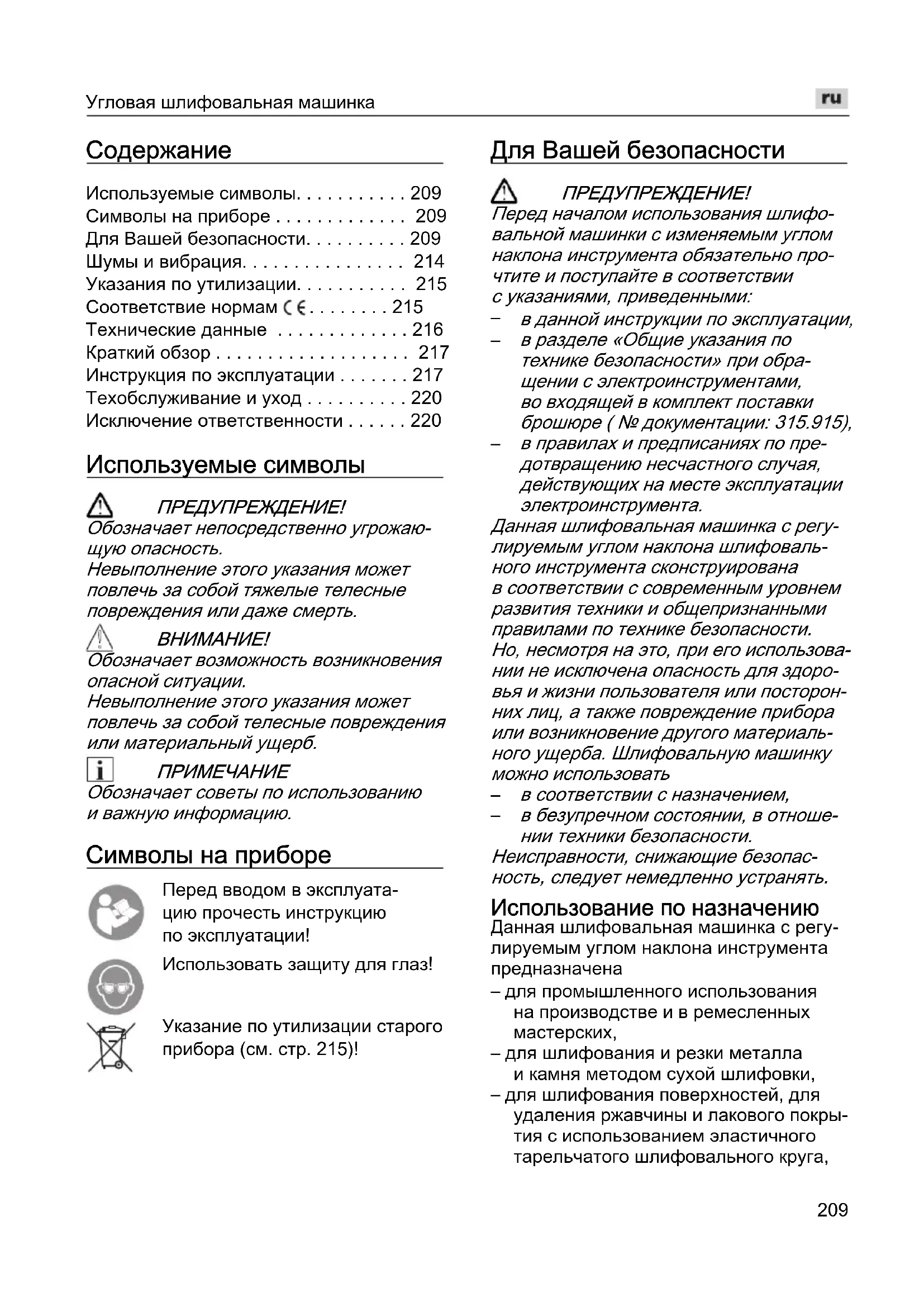 Обозначает советы по использованию и важную информацию. Символы на приборе Перед вводом в эксплуата- цию прочесть инструкцию по эксплуатации! Использовать защиту для глаз! Указание по утилизации старого прибора (см. стр. 215)! Для Вашей безопасности ПРЕДУПРЕЖДЕHИЕ! Перед началом использования шлифо- вальной машинки с изменяемым углом наклона инструмента обязательно про- чтите и поступайте в соответствии с указаниями, приведенными: