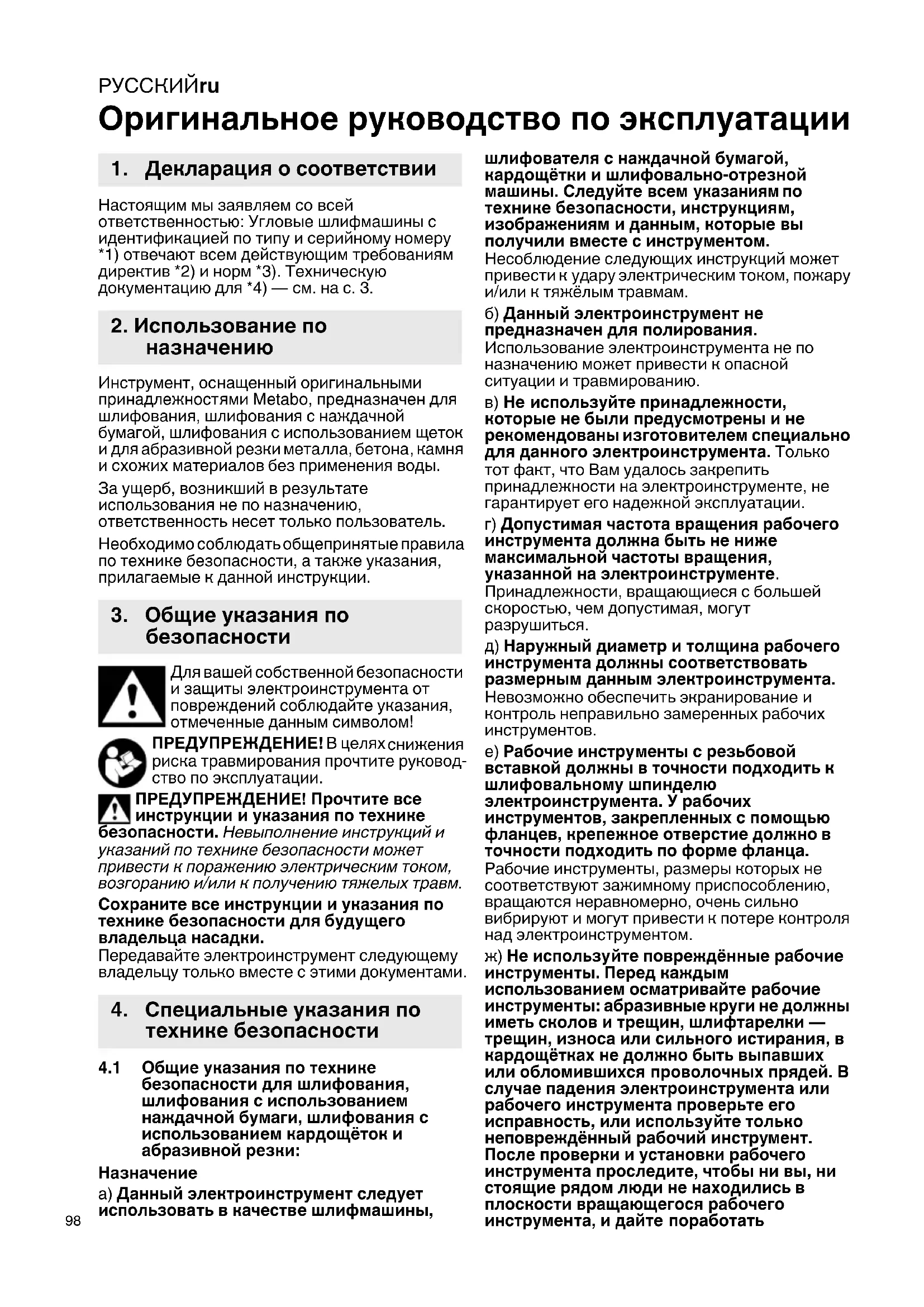 Оригинальное руководство по эксплуатации Настоящим мы заявляем со всей ответственностью: Угловые шлифмашины с идентификацией по типу и серийному номеру *1) отвечают всем действующим требованиям директив *2) и норм *3). Техническую документацию для *4) — см. на с. 3. Инструмент, оснащенный оригинальными принадлежностями Metabo, предназначен для шлифования, шлифования с наждачной бумагой, шлифования с использованием щеток и для абразивной резки металла, бетона, камня и схожих материалов без применения воды. За ущерб, возникший в результате использования не по назначению, ответственность несет только пользователь. Необходимо соблюдать общепринятые правила по технике безопасности, а также указания, прилагаемые к данной инструкции. Для вашей собственной безопасности и защиты электроинструмента от повреждений соблюдайте указания, отмеченные данным символом! ПРЕДУПРЕЖДЕНИЕ! В целях