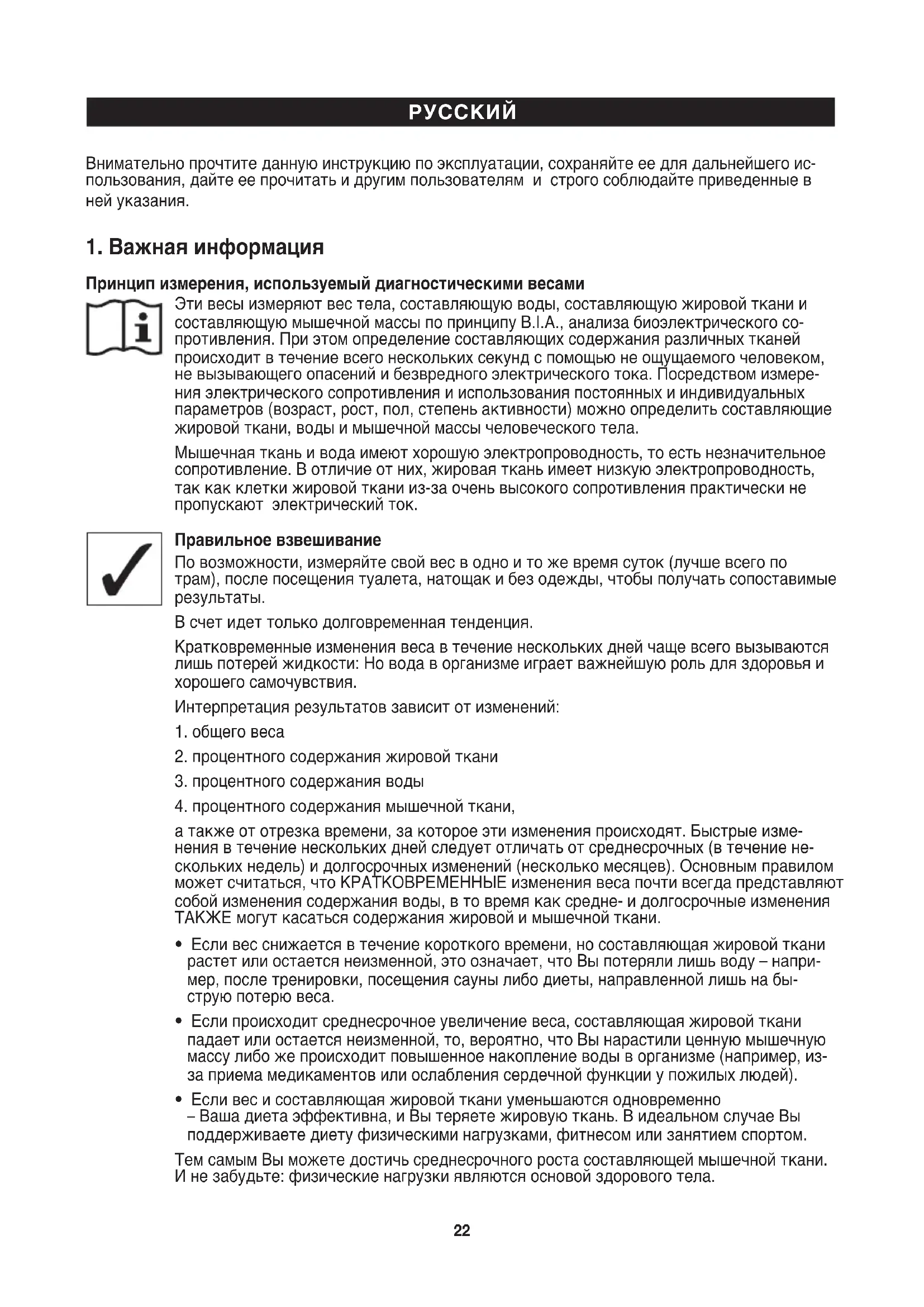 Si la báscula detecta un error durante la medición, se visualizará "FFFF"/"Err". Si usted se sube a la báscula antes de que se visualice "0.0" en la pantalla, la báscula no funcionará correctamente. Posibles causas del error: – Se ha excedido la capacidad máxima de carga de 150 kg. – La resistencia eléctrica entre los electrodos y la planta de los pies es excesiva (por ejemplo por existir una fuerte callosidad). – La masa adiposa está fuera de la gama de va- lores medibles (inferior a un 3% o superior a un 55%). – La masa líquida está fuera de la gama de valo- res medibles (inferior a un 36% o superior a un 70%). Solución: – Mida pesos inferiores al límite máximo admisible. – Repita la medición descalzo. En caso necesario, humedezca ligeramente las plantas de sus pies. En caso necesario, saque las callosidades de la plantas de los pies. – Repita la medición descalzo. – En caso necesario, humedezca ligeramente las plantas de sus pies. – Repita la medición descalzo. – En caso necesario, humedezca ligeramente las plantas de sus pies.22 Внимательно прочтите данную инструкцию по эксплуатации, сохраняйте ее для дальнейшего ис- пользования, дайте ее прочитать и другим пользователям и строго соблюдайте приведенные в ней указания. 1.Важнаяинформация Принципизмерения,используемыйдиагностическимивесами Эти весы измеряют вес тела, составляющую воды, составляющую жировой ткани и составляющую мышечной массы по принципу B.I.A., анализа биоэлектрического со- противления. При этом определение составляющих содержания различных тканей происходит в течение всего нескольких секунд с помощью не ощущаемого человеком, не вызывающего опасений и безвредного электрического тока. Посредством измере- ния электрического сопротивления и использования постоянных и индивидуальных параметров (возраст, рост, пол, степень активности) можно определить составляющие жировой ткани, воды и мышечной массы человеческого тела. Мышечная ткань и вода имеют хорошую электропроводность, то есть незначительное сопротивление. В отличие от них, жировая ткань имеет низкую электропроводность, так как клетки жировой ткани из-за очень высокого сопротивления практически не пропускают электрический ток. Правильноевзвешивание По возможности, измеряйте свой вес в одно и то же время суток (лучше всего по трам), после посещения туалета, натощак и без одежды, чтобы получать сопоставимые результаты. В счет идет только долговременная тенденция. Кратковременные изменения веса в течение нескольких дней чаще всего вызываются лишь потерей жидкости: Но вода в организме играет важнейшую роль для здоровья и хорошего самочувствия. Интерпретация результатов зависит от изменений: