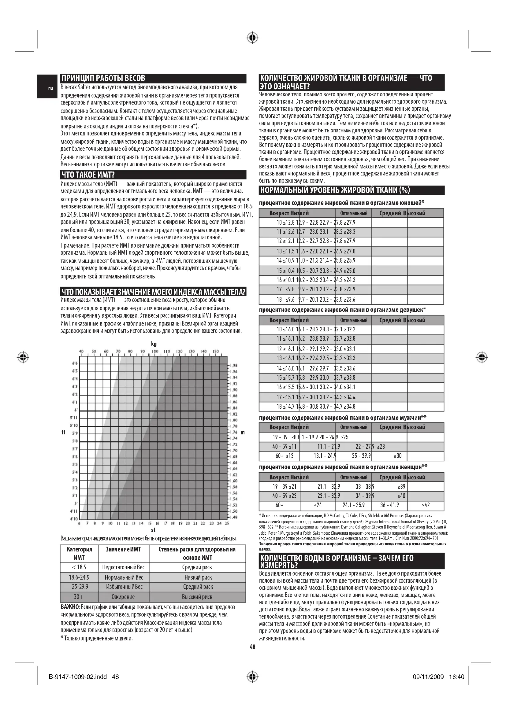 4 to 20% 70 to 58% 21 to 29% 58 to 52 % 30 to 32 % 52 to 49% 33 and over 49 to 37% *** Источник: выдержки из Wang & Deurenberg: (Содержание воды в безжировой составляющей организма). (Американский журнал медицинского питания) Nutr 1999, 69 8 -841. Для тех, кто занимается спортом: учтите, что в зависимости от вида спорта содержание жировой ткани в организме может быть меньше, а воды – больше, чем указано выше. На результаты измерения количества воды в организме оказывает влияние соотношение жировой и мышечной ткани в организме. Если в организме наблюдается повышенное содержание жировой массы или низкое содержание мышечной массы, то содержание воды в организме, скорее всего, также будет низким. Важно помнить, что такие показатели, как вес тела, процентное содержание жировой ткани и воды, являются лишь одними из средств, которые можно использовать для перехода к здоровому образу жизни. В разные дни показатели могут отличаться, поэтому необходимо следить за изменениями в течение длительного времени, а не делать выводы на основании разовых результатов измерения.