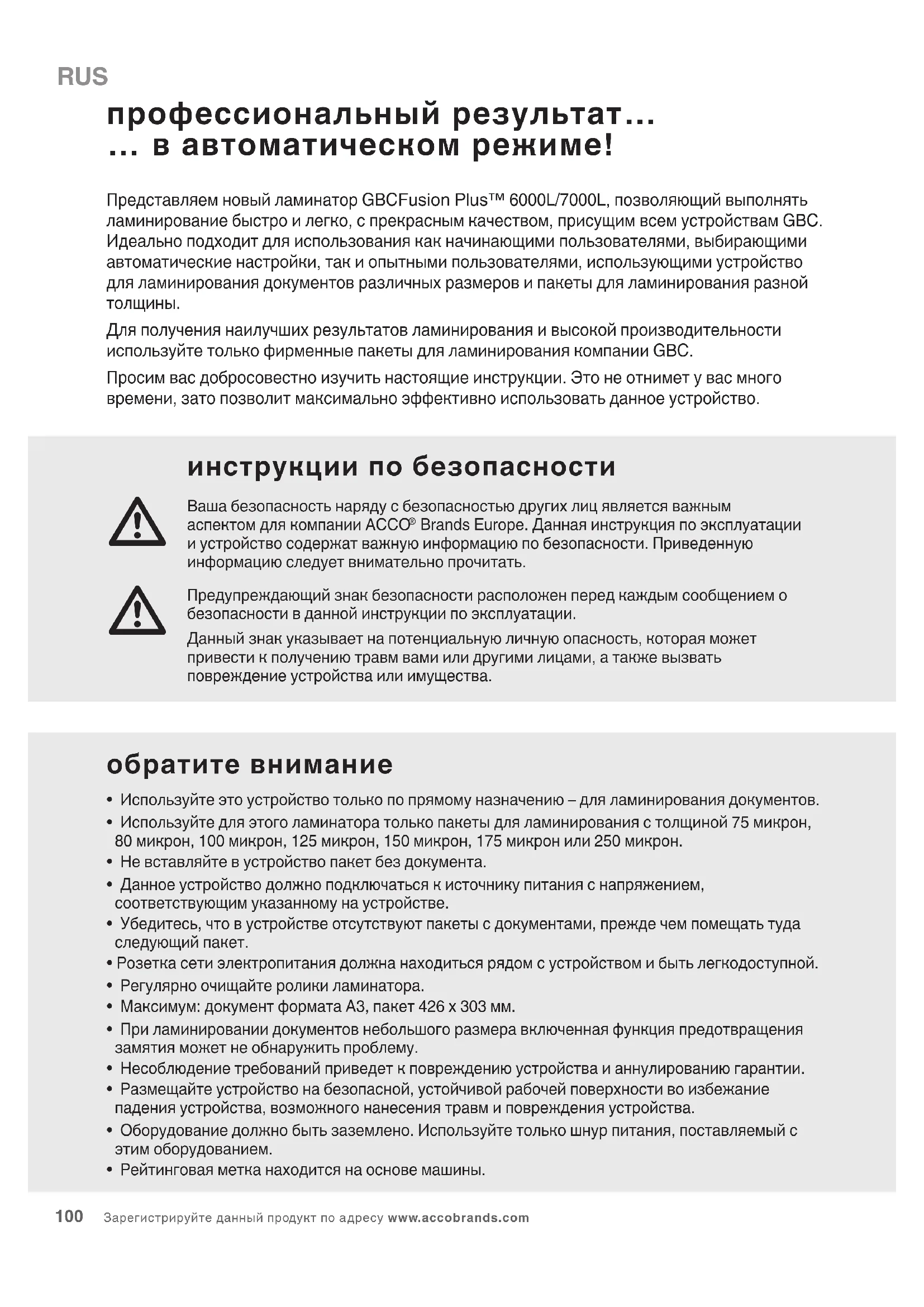- Используйте это устройство только по прямому назначению – для ламинирования документов.• Используйте для этого ламинатора только пакеты для ламинирования с толщиной 75 микрон, 80 микрон, 100 микрон, 125 микрон, 150 микрон, 175 микрон или 250 микрон.• Не вставляйте в устройство пакет без документа.• Данное устройство должно подключаться к источнику питания с напряжением, соответствующим указанному на устройстве.• Убедитесь, что в устройстве отсутствуют пакеты с документами, прежде чем помещать туда следующий пакет.• Розетка сети электропитания должна находиться рядом с устройством и быть легкодоступной.• Регулярно очищайте ролики ламинатора.• Максимум: документ формата A3, пакет 426 x 303 мм.• При ламинировании документов небольшого размера включенная функция предотвращения замятия может не обнаружить проблему.• Несоблюдение требований приведет к повреждению устройства и аннулированию гарантии.• Размещайте устройство на безопасной, устойчивой рабочей поверхности во избежание падения устройства, возможного нанесения травм и повреждения устройства.• Оборудование должно быть заземлено. Используйте только шнур питания, поставляемый с этим оборудованием.• Рейтинговая метка находится на основе машины. профессиональный результат… … в автоматическом режиме! Представляем новый ламинатор GBC Fusion Plus™ 6000L/7000L, позволяющий выполнять ламинирование быстро и легко, с прекрасным качеством, присущим всем устройствам GBC. Идеально подходит для использования как начинающими пользователями, выбирающими автоматические настройки, так и опытными пользователями, использующими устройство для ламинирования документов различных размеров и пакеты для ламинирования разной