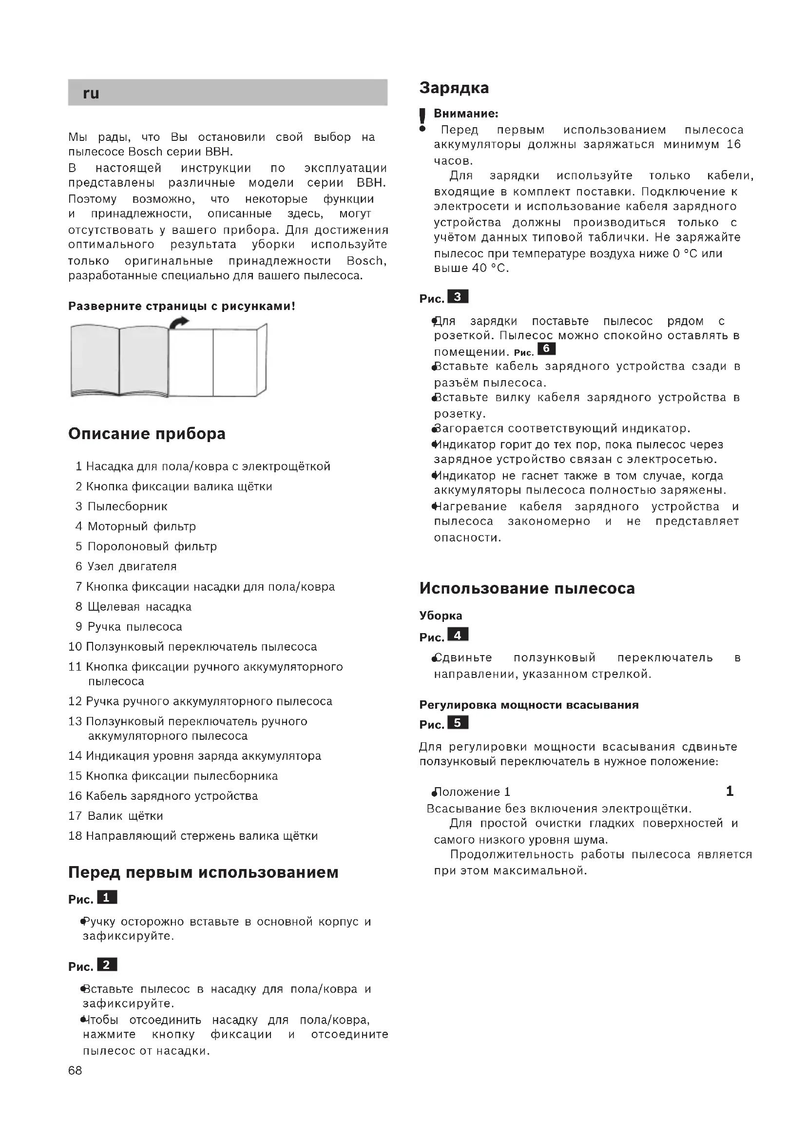 Мы рады, что Вы остановили свой выбор на пылесосе Bosch серии BBH. В настоящей инструкции по эксплуатации представлены различные модели серии BBH. Поэтому возможно, что некоторые функции и принадлежности, описанные здесь, могут отсутствовать у вашего прибора. Для достижения оптимального результата уборки используйте только оригинальные принадлежности Bosch, разработанные специально для вашего пылесоса. Разверните страницы с рисунками! Описание прибора 1 Насадка для пола/ковра с электрощёткой 2 Кнопка фиксации валика щётки 3 Пылесборник 4 Моторный фильтр 5 Поролоновый фильтр 6 Узел двигателя 7 Кнопка фиксации насадки для пола/ковра 8 Щелевая насадка 9 Ручка пылесоса 10 Ползунковый переключатель пылесоса 11 Кнопка фиксации ручного аккумуляторного