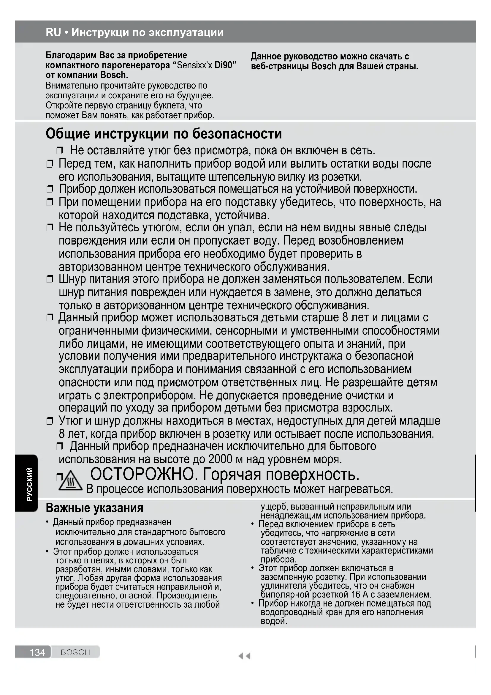 - Данный прибор предназначен исключительно для стандартного бытового использования в домашних условиях.• Этот прибор должен использоваться только в целях, в которых он был разработан, иными словами, только как утюг. Любая другая форма использования прибора будет считаться неправильной и, следовательно, опасной. Производитель не будет нести ответственность за любой ущерб, вызванный неправильным или ненадлежащим использованием прибора.• Перед включением прибора в сеть убедитесь, что напряжение в сети соответствует значению, указанному на табличке с техническими характеристиками прибора.• Этот прибор должен включаться в заземленную розетку. При использовании удлинителя убедитесь, что он снабжен биполярной розеткой 16 A с заземлением.• Прибор никогда не должен помещаться под водопроводный кран для его наполнения водой.Данное руководство можно скачать с веб-страницы Bosch для Вашей страны.135 BOSCH