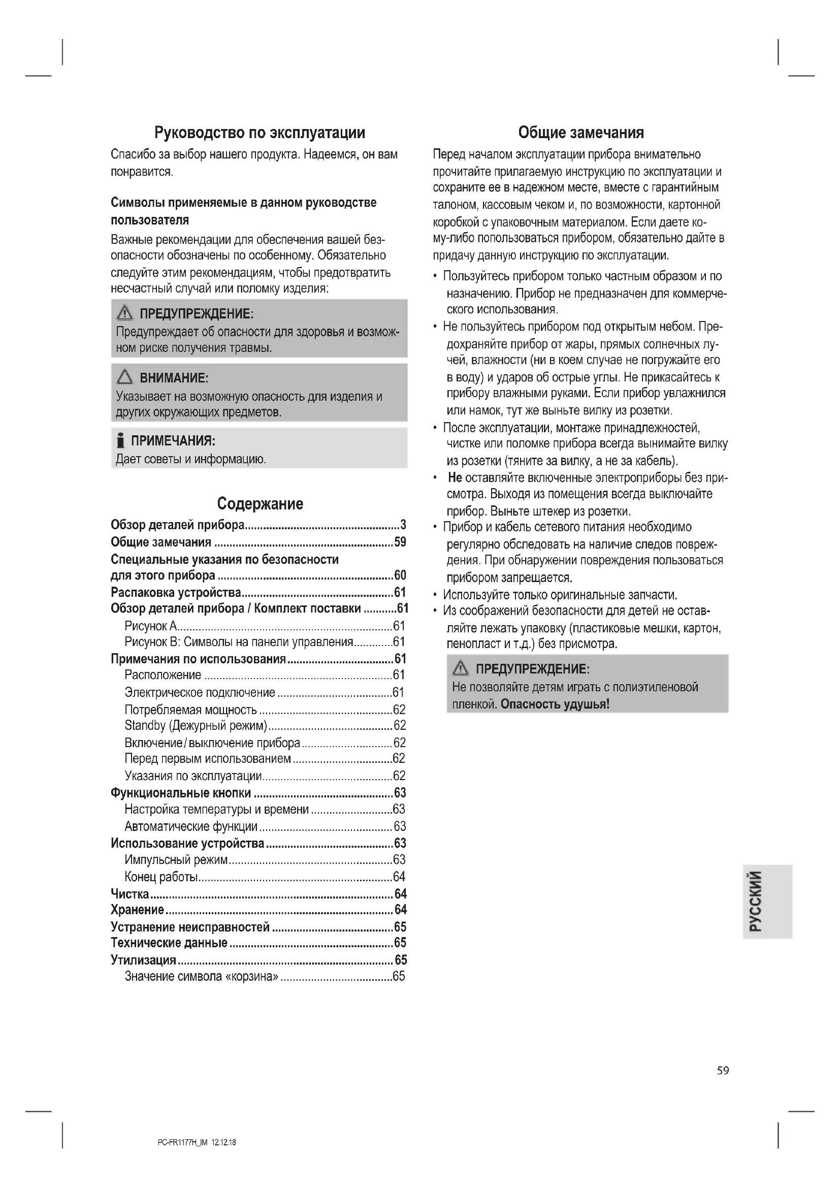 - Значение символа «корзина» Общие замечания Перед началом эксплуатации прибора внимательно прочитайте прилагаемую инструкцию по эксплуатации и сохраните ее в надежном месте, вместе с гарантийным талоном, кассовым чеком и, по возможности, картонной коробкой с упаковочным материалом. Если даете ко- му-либо попользоваться прибором, обязательно дайте в придачу данную инструкцию по эксплуатации. p. 65